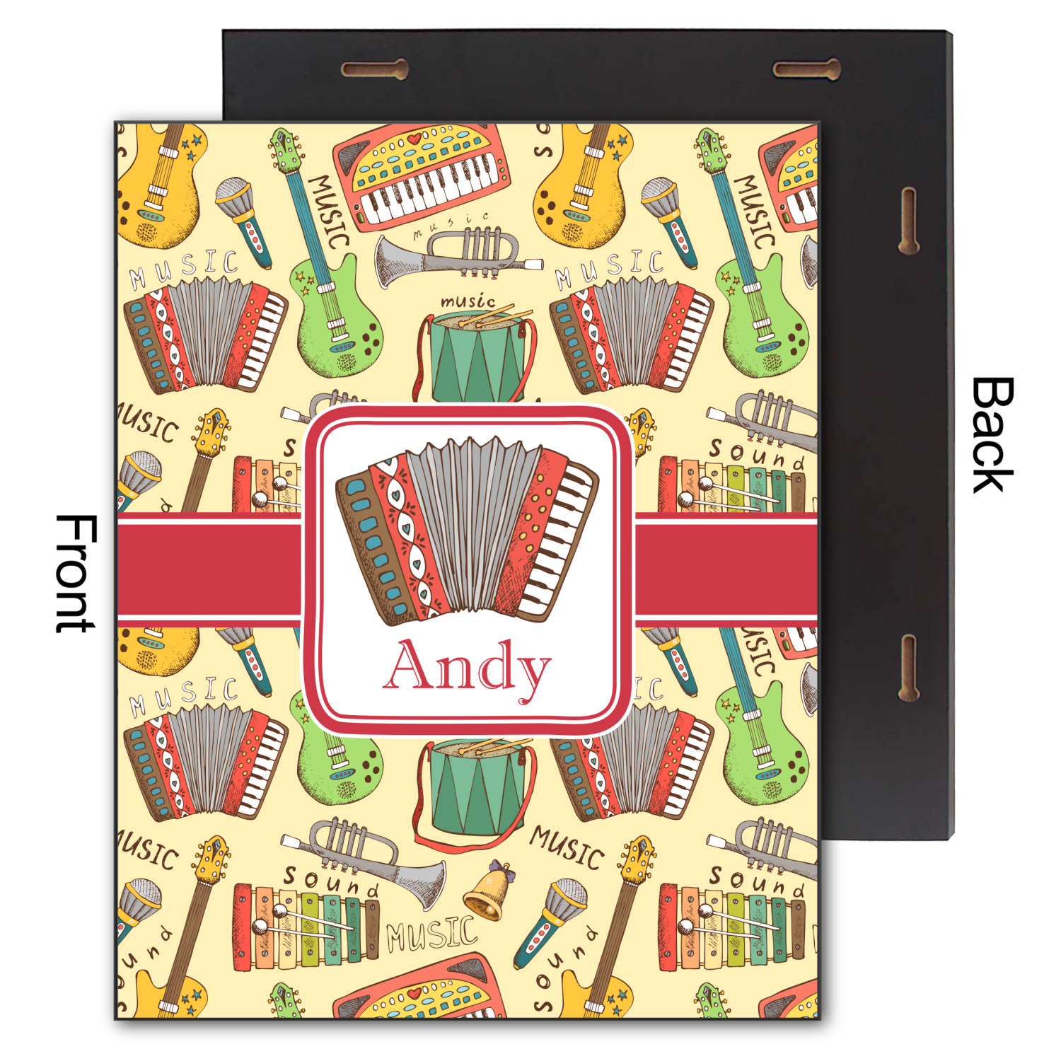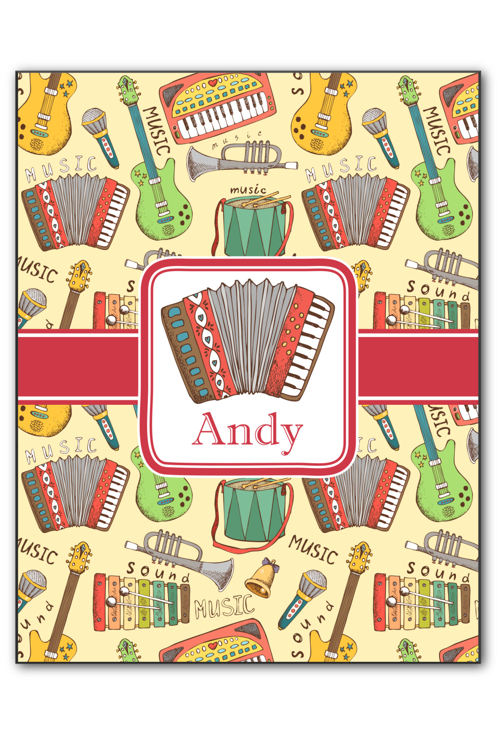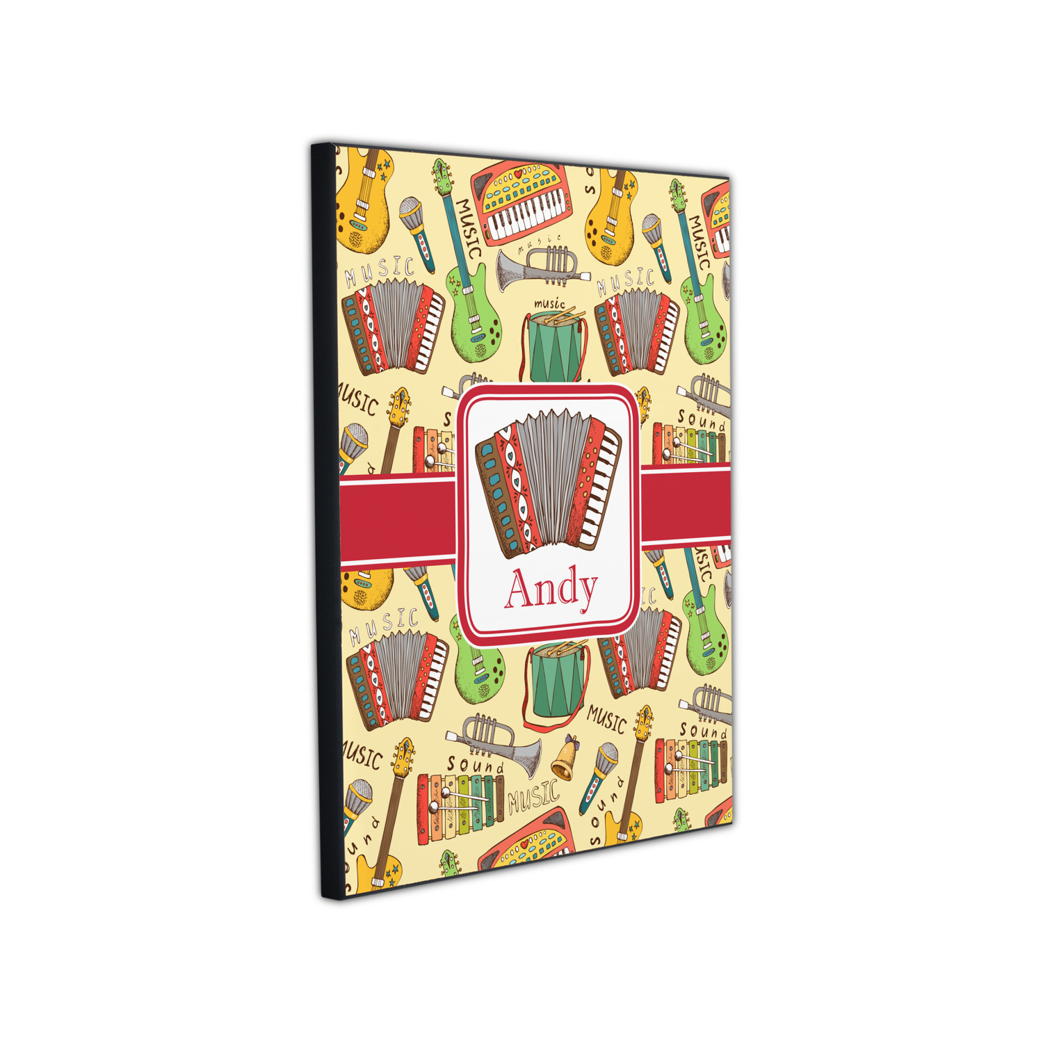 We have selected a classic red ribbon along with a square label that features the accordion along with a name for the personalization. You have a choice of instruments to feature on the label - your choices are: vintage guitar, xylophone, accordion, trumpet, keyboard, drum, microphone or bell and of course you can personalize it with your choice of text.