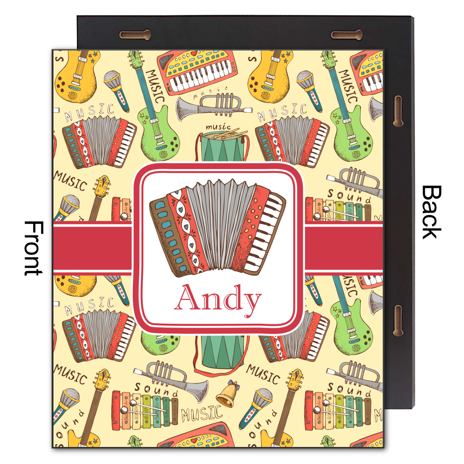 We have selected a classic red ribbon along with a square label that features the accordion along with a name for the personalization. You have a choice of instruments to feature on the label - your choices are: vintage guitar, xylophone, accordion, trumpet, keyboard, drum, microphone or bell and of course you can personalize it with your choice of text.
