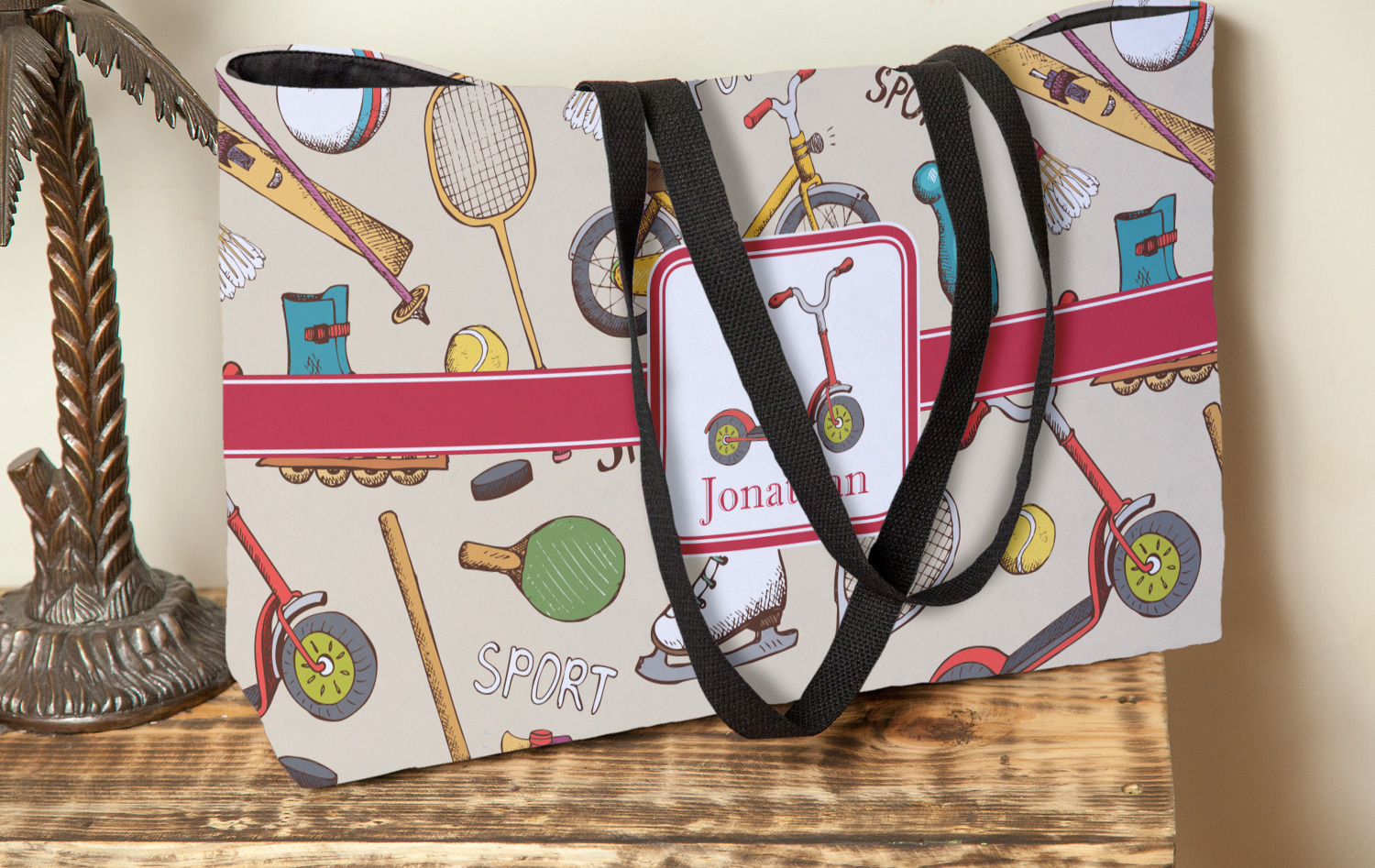 These beach totes are handmade here in the USA. Fabric is printed with your design. The tote is then sewn from the fabric pieces, lining and handles added.
