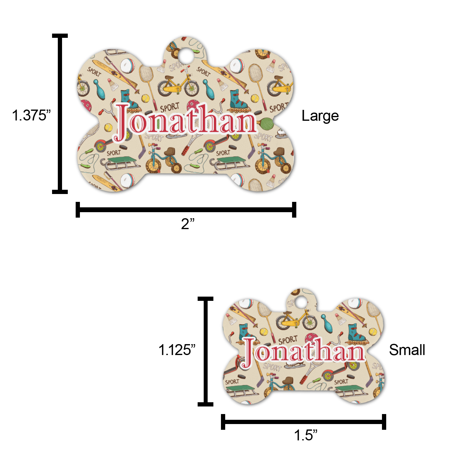 The small bone dog tag size is perfect to pair with our small dog collars, the large size pairs well with our large dog collars.