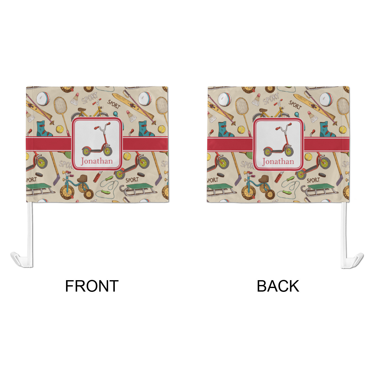 Our personalized flags are made from a durable, yet lightweight cloth that will proudly bear your logo or design of choice, while withstanding the outside elements. We have two size options - 8" x 11" and 11" x 15". Both come with a flag pole which includes a clip that secures the pole to the side window, whether it is rolled up or down. The flags are printed on both sides to display your design from all directions.