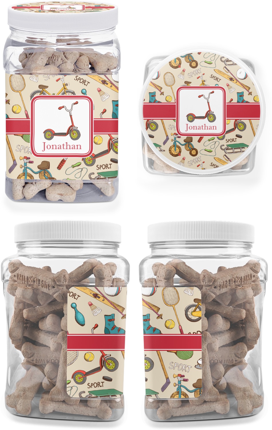 This half gallon jar, made from a sturdy plastic, is the perfect way to keep treats from any naughty pet paws, while still keeping them ready on hand for when your pup performs an impressive trick. This dog cookie jar features a screw-on, white lid that displays your personalized design on a vinyl sticker. We apply another customized sticker that wraps around the front and sides of the jar. Our dog treat jar also has indentations on the rear ends of the sides, which allows for convenient handling, and its square frame allows for easy storage.