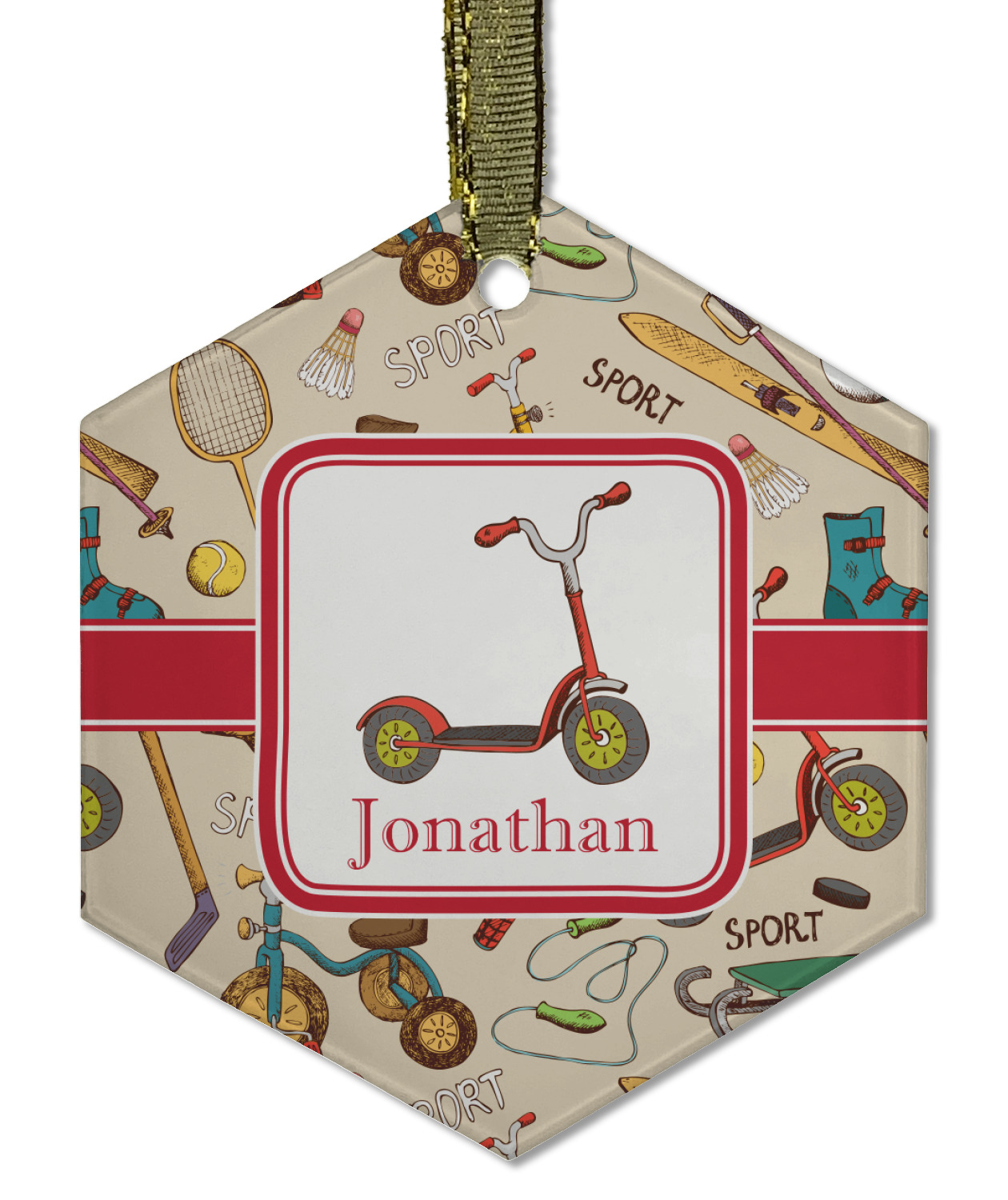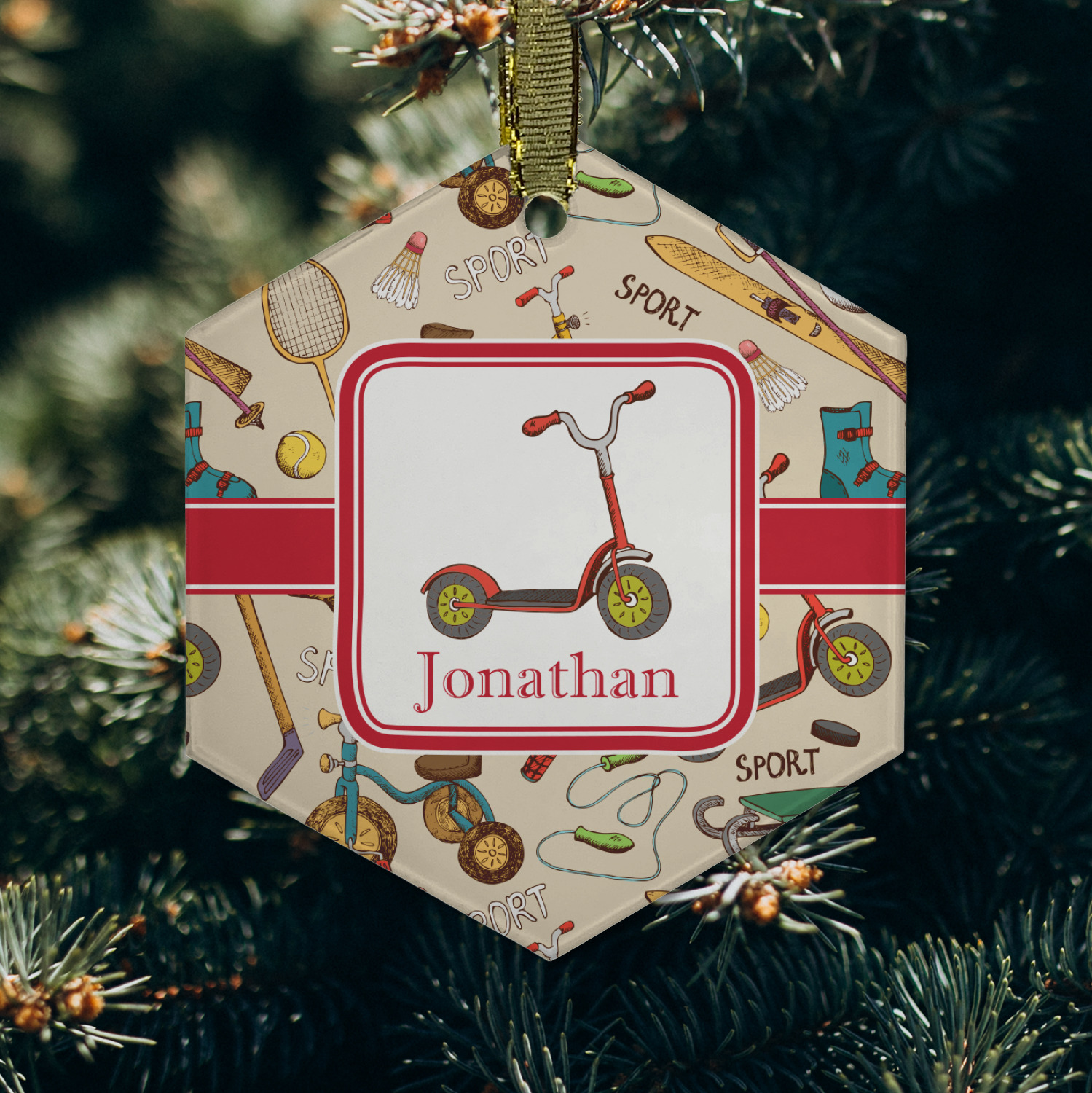 Each of our flat glass ornaments come with a gold string to hang on your Christmas tree with style! We offer two different shapes - flat, round ball or a hexagon. Both glass ornaments have a frosted coating on one side where we print your design while the other side is a clear gloss to give your personalized ornament a sheen finish. Our flat round glass ornament is approximately 3.5" x 3.5" while the flat hexagon ornaments are approximately 3.5" x 3".