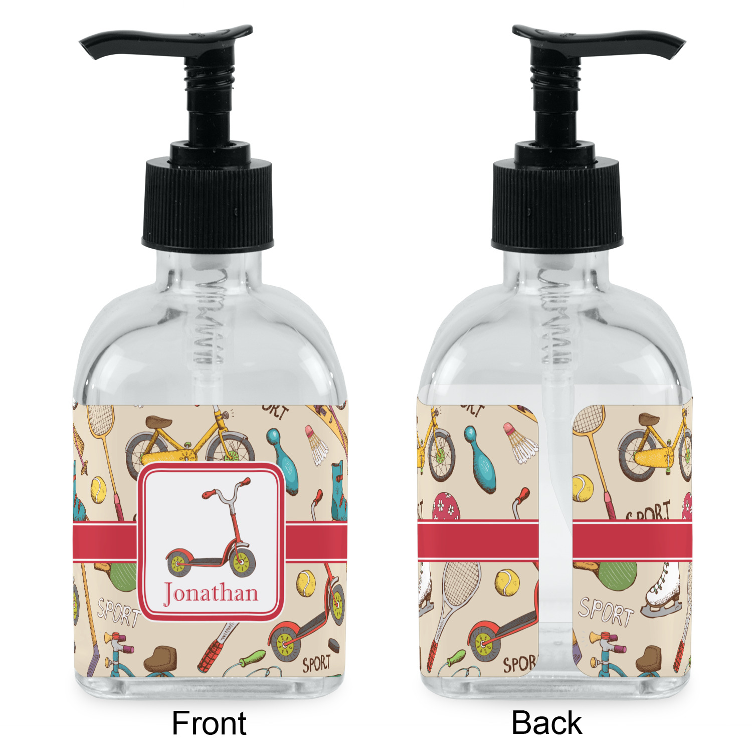 Crafted from a high-quality glass, these soap dispensers and lotion dispensers are durable and robust, while still looking elegant. They are sold with black pumps. Each soap dispenser pump measures at 6.5 by 2.25 inches. On these soap pumps, we display your customized design on a personalized vinyl adhesive on three sides. That way, you can judge how much liquid is in the bottles from the back.