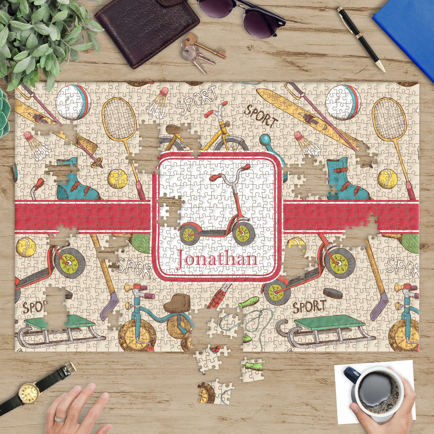 Depending on the look you are trying to achieve, you can add; a thematic pattern or background, with a photo in a frame and text or personalization to your puzzle. Basically if you can imagine it, you can design it!