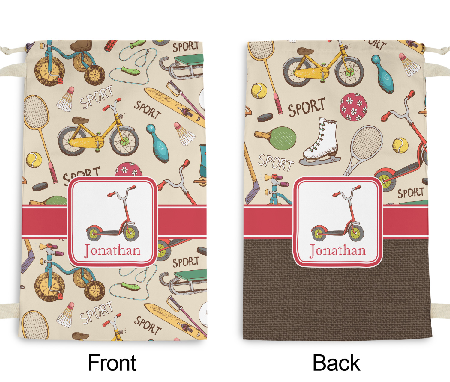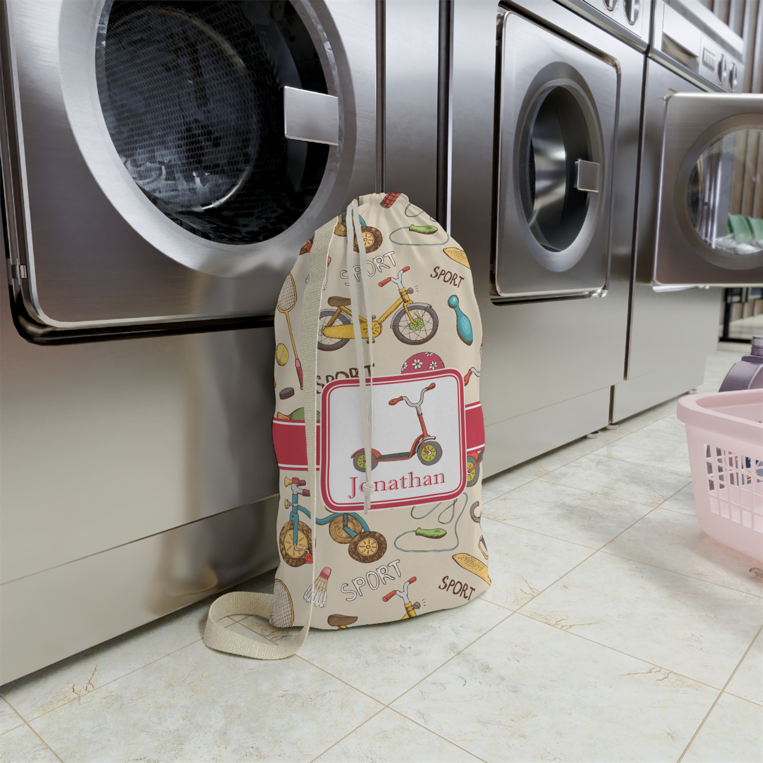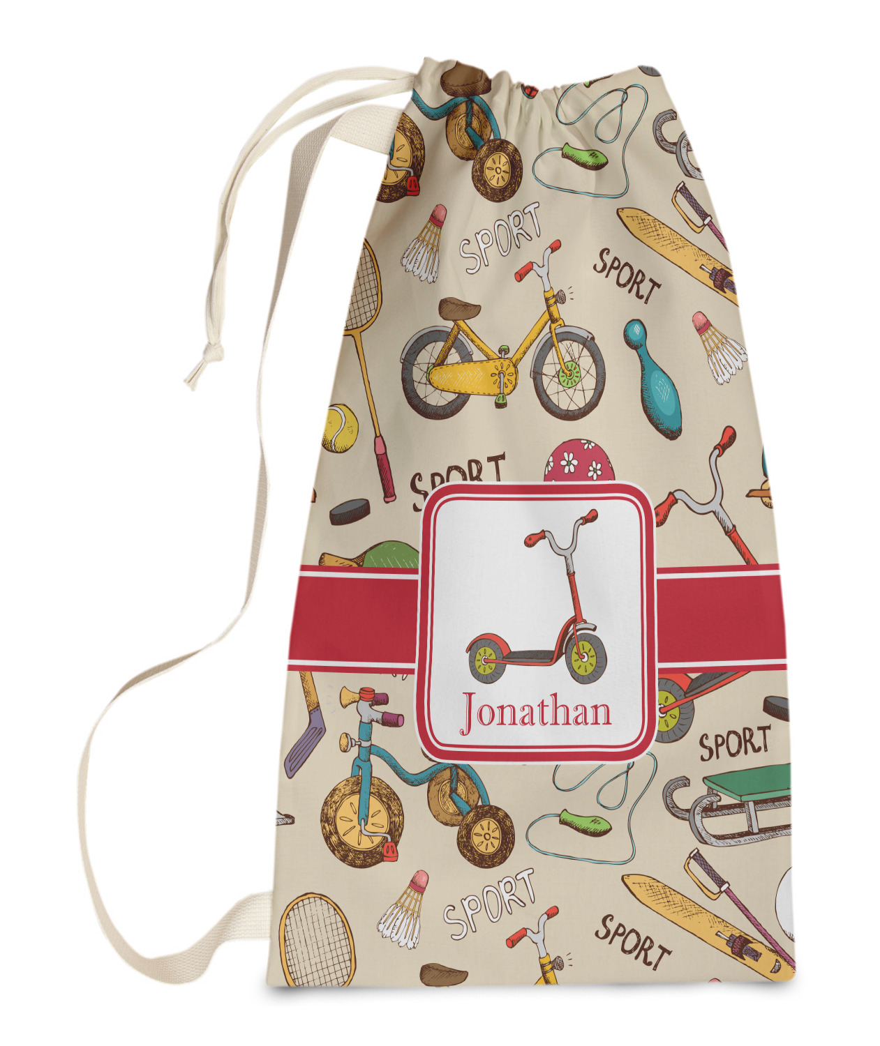 Carry your laundry in style with these customized laundry bags. Available in two sizes, featuring a natural colored woven strap and a cinch cord, these bags hold a lot of clothes or anything else you want to fit in them.