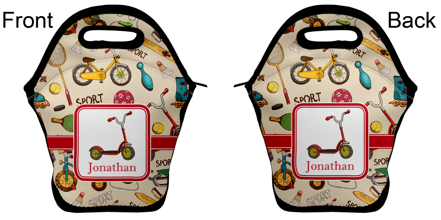 Our personalized lunch bags are made from a strong neoprene, and secure with a zipper closure that lines the top of the bag.The edges of the neoprene are sewn together with a heavy duty stitch, adding to the durability of the bag. The is accompanied by a reinforced handle at its top, for the easy transport of your lunch. We display your personalization across both the front and back of this neoprene lunch bag, while the remaining sides are a sleek black in color. Each bag measures at 13.5 inches tall, and 11.5 inches wide.