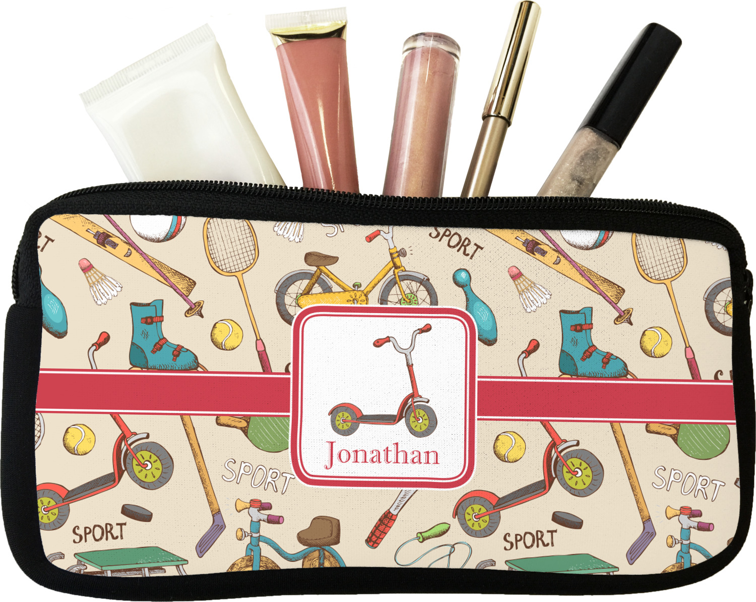 Our personalized makeup bags are available in many different designs, patterns and colors - so you are sure to find one that will love. They are made of neoprene (same material as wet-suits) and thus are water resistant, so spillages in your makeup bag will not end up all over you purse. They are customized on one side and are black on the other side and the zipper is black as well.
