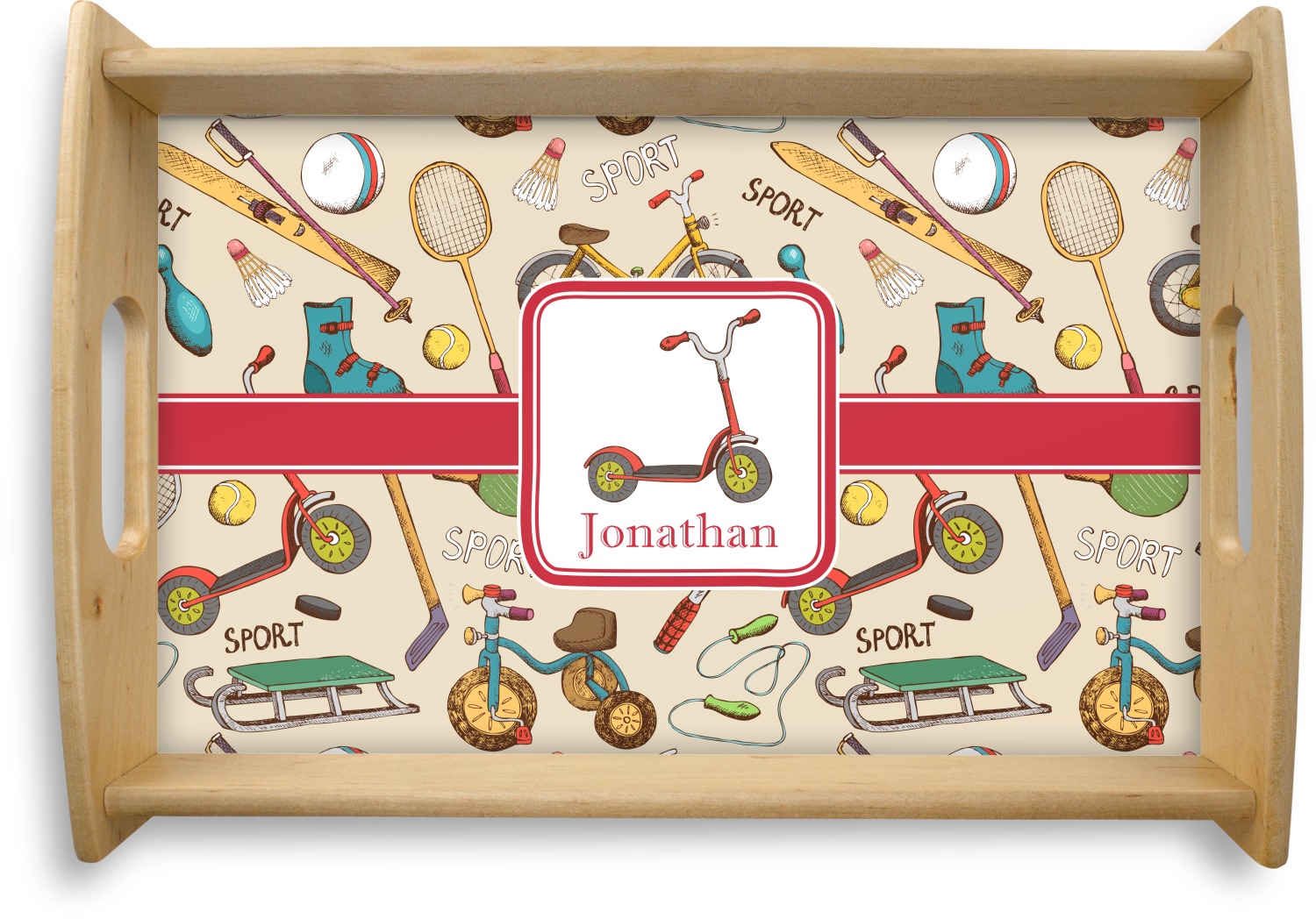 This serving tray with handles features square edges and two rounded sides, creating a very modern look. Each side is fabricated from a beautifully cut, natural wood. The bottom of the interior of the tray displays your customized design in bright, vibrant color. The tray is sold in both a black color and a natural wood look. Each variation of the wood serving tray has two sizes: Small, which is 14" x 10" x 2.25", and Large, which is 19.5" x 13.5" x 2.75".
