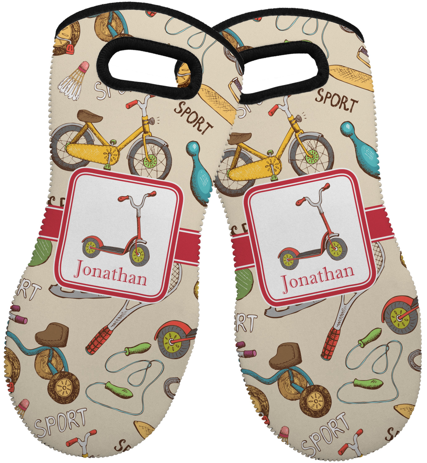 These heat resistant gloves are made entirely of a durable neoprene; the front features a softer texture, while the palm's side has a textured surface, meant to handle heat up to 500 degrees Fahrenheit. Thick, heavy duty stitching connects the two sides. A small, oval cutout appears on the front, and can be used to hang and store the mitt. Your personalization appears on the front, and the upper part of the back of the mitt. The style of these oven mitts are suitable for both the right and left hand, depending on your needs. If you need one for each hand, be sure to order two!