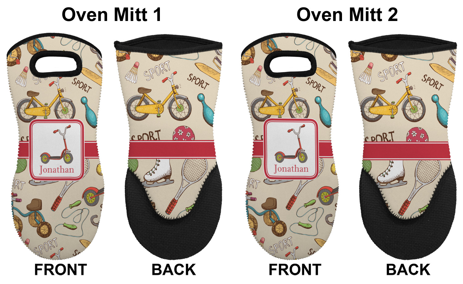 These heat resistant gloves are made entirely of a durable neoprene; the front features a softer texture, while the palm's side has a textured surface, meant to handle heat up to 500 degrees Fahrenheit. Thick, heavy duty stitching connects the two sides. A small, oval cutout appears on the front, and can be used to hang and store the mitt. Your personalization appears on the front, and the upper part of the back of the mitt. The style of these oven mitts are suitable for both the right and left hand, depending on your needs. If you need one for each hand, be sure to order two!