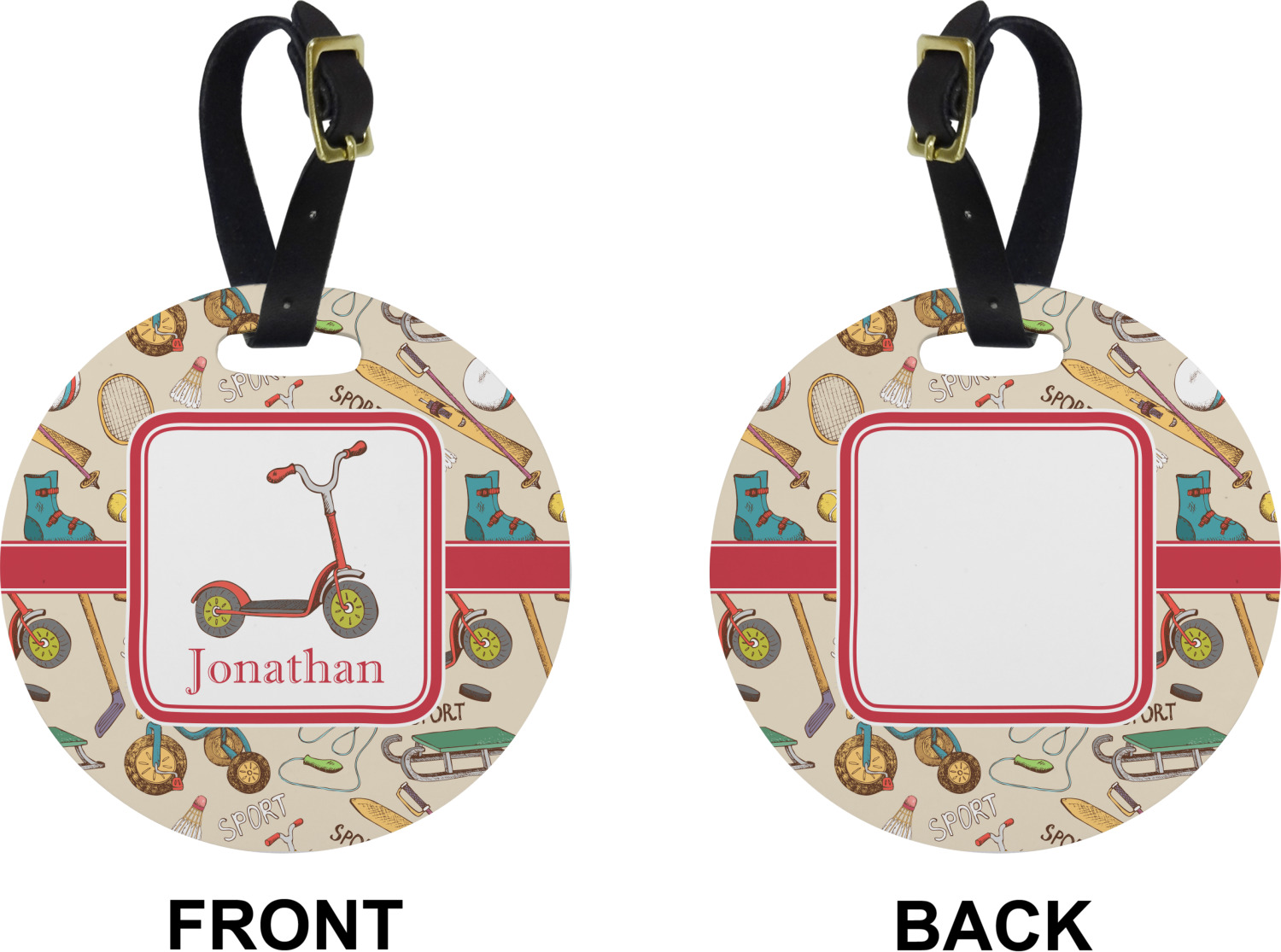 These personalized bag tags are sold in a variety of shapes, so that you may find the product that meets your vision exactly. We sell a round luggage tag, which measures at approximately 4" x 4". Our square luggage tag is about 3.5" x 3.5", while our rectangular version is 2.75" x 4 ".