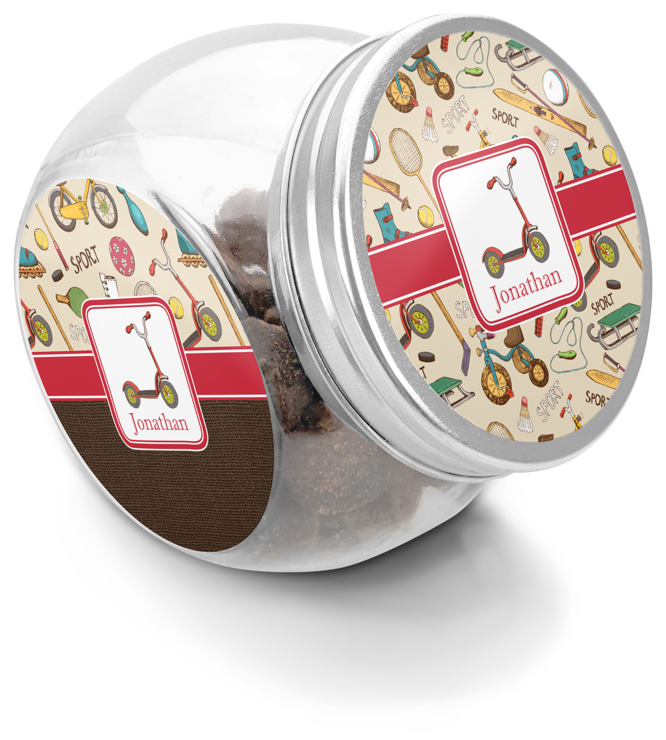 This treat jar is an excellent way to store treats for your favorite canine or feline. Moreover, their delicate, classy appearance makes them a tasteful addition to your countertop's décor. Crafted from clear glass, its unique construction and silver metal, screw-on lid allows for quick and easy access. Three, permanent, vinyl stickers are applied to both sides of the jar and lid, presenting your personalized design. The base of this glass, dog treat jar is 3.4" x 4.75", and the jar stands at 5" tall. Though on the smaller side, this jar is best suited for smaller treats or training treats.