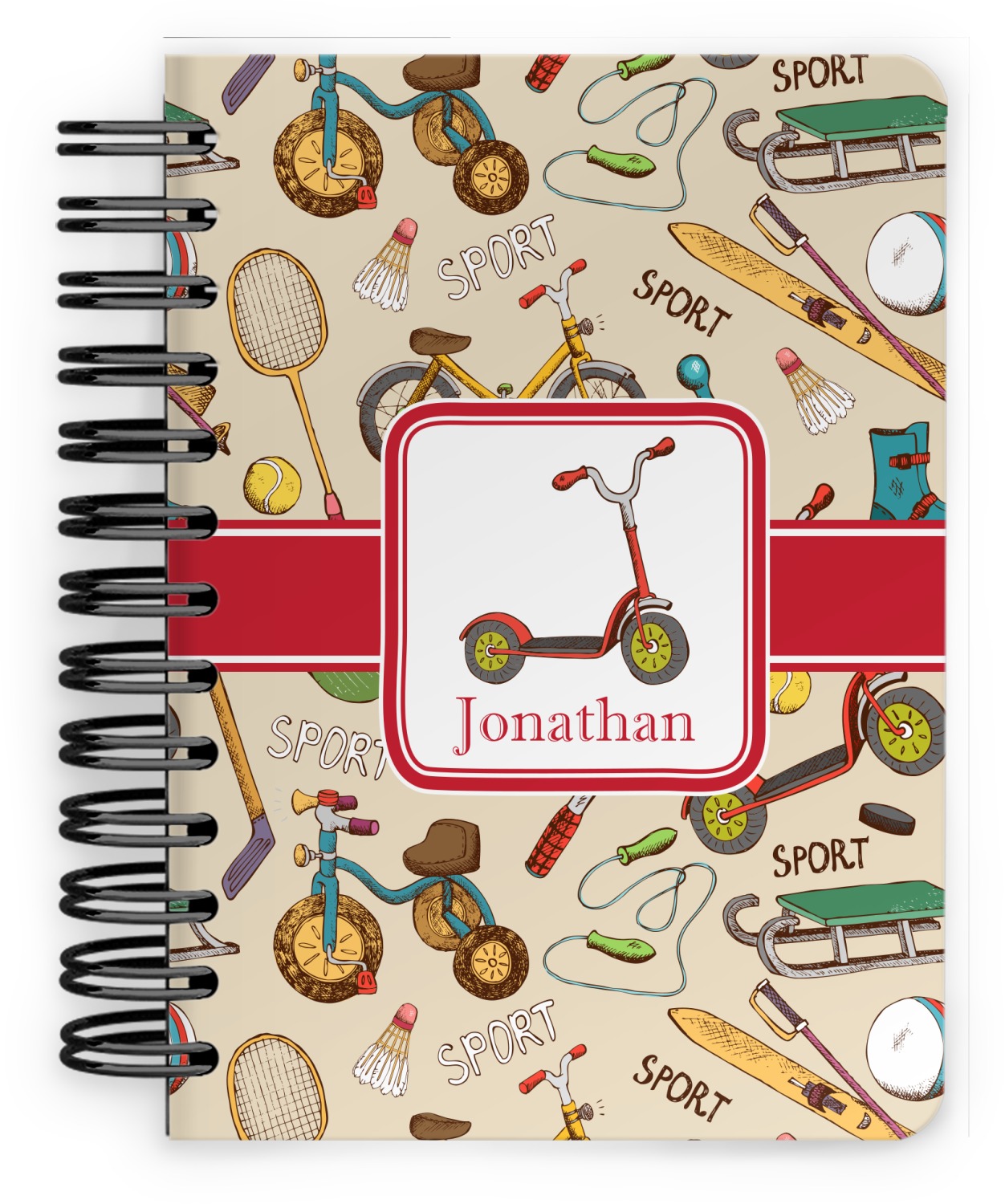 This spiral notebook includes 75 sheets of thick, ruled paper. The front and back of this custom notebook is made of a robust, laminate, plastic covering. We print your personalization on these two panels, underneath a glossy finish, which emphasizes the colors of your design. The two panels and the sheets of paper are held together by a sturdy, black coil. The paper within your bound notebook is perforated for easy, clean tearing.
