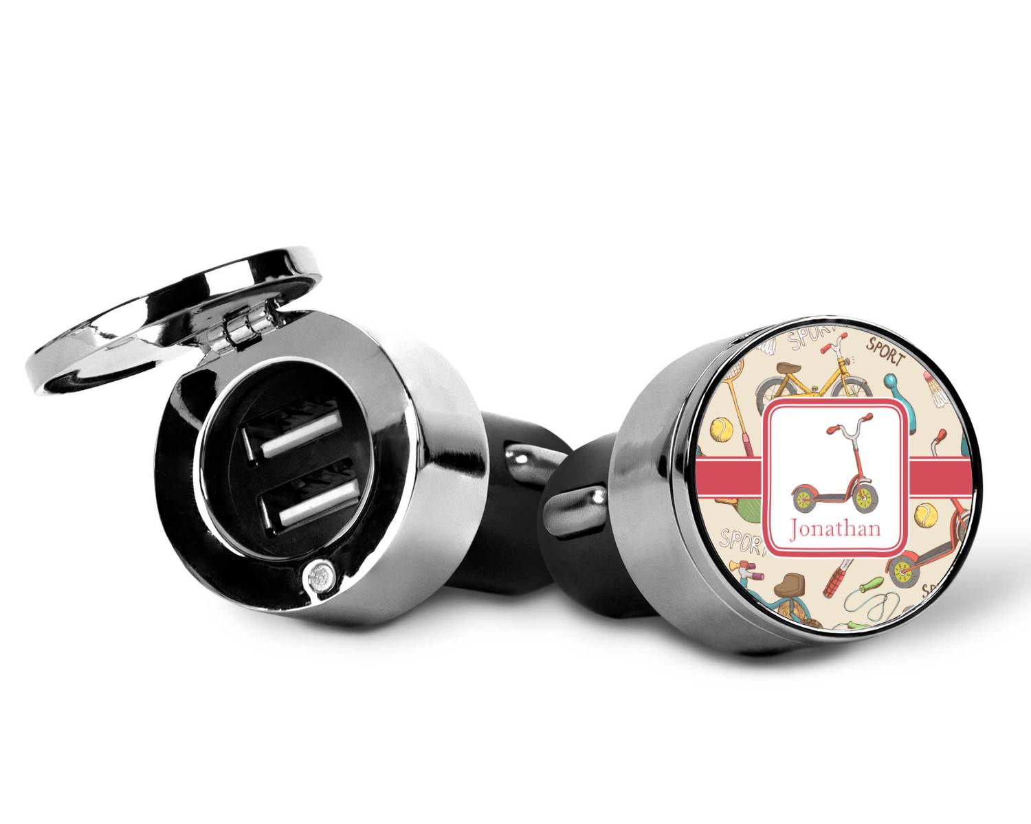 This car charger adapter converts your cars bland cigarette lighter into a decorative, personalized, and operational USB charging port. Made of solid, silver-plated metal, these chargers feature a flip-open lid that both displays your customized design and conceals two USB ports. The metal lid of the USB car charger adapter is 1.5" in diameter and seals due to a small, ingrained magnet on both the charger and its lid. The cigarette lighter insert, itself, is colored black.