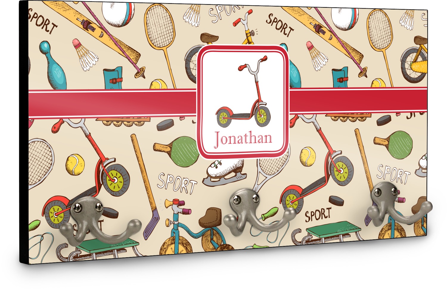 This coat rack is the perfect way to add some personality to your wall or entryway. The board is made of a strong maple that is approximately 16" x 8". The three 2-prong hooks are a sturdy metal that have three screws attaching them to the board. Your design is printed right onto the front of the board while the back and sides are a simple black.