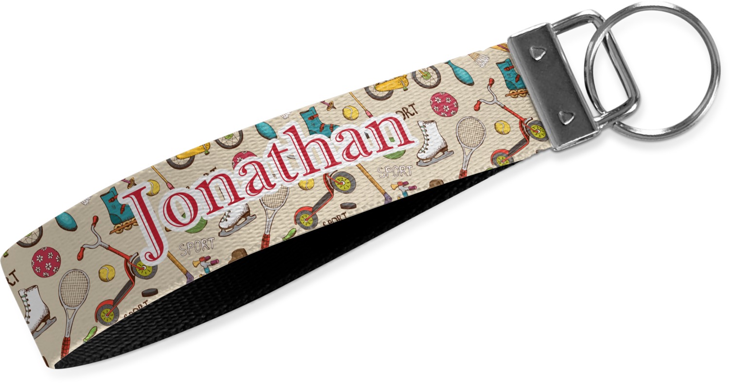 These key fob keychains are made from a polyester weave, right here in the USA. They feature a silver, metal clasp, attached to a round keyring. The piece gives the personalized wristlet a beautiful, finished look. Your customized design is printed on the outside of the keychain strap. We carry these wristlets in two sizes: small, which is 5 inches in width, and large, which is 5.5 inches in width.