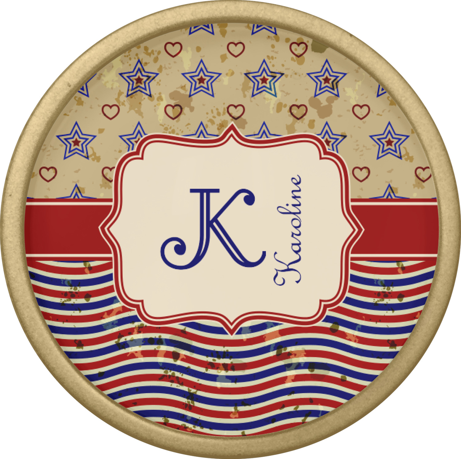 There is a red ribbon separating the perfectly sweat stained patterns. The decorative label is the perfect place to add your name and initial to make it truly yours.