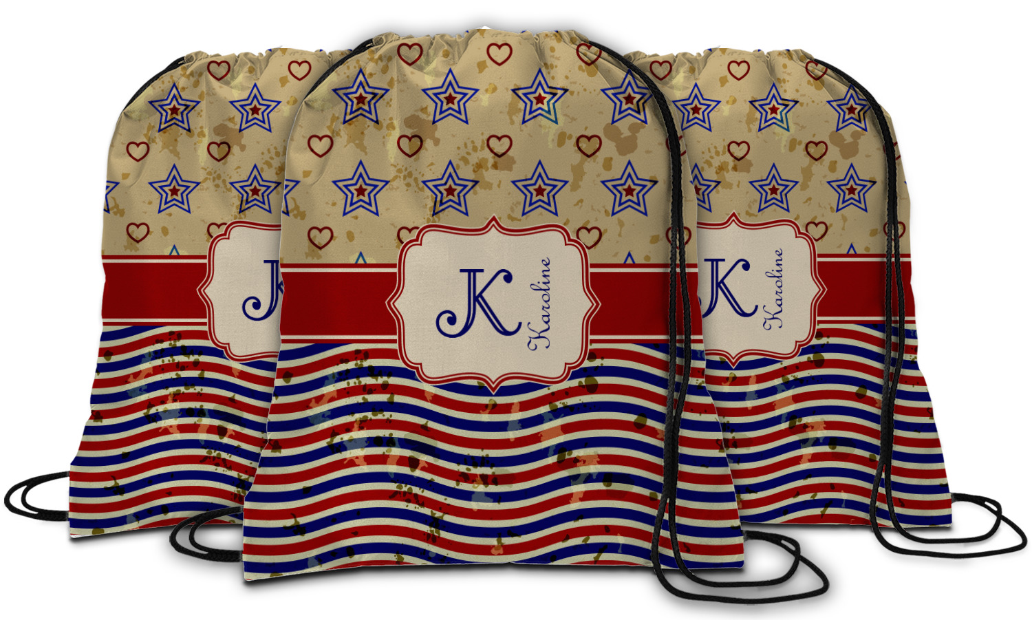 Our drawstring backpacks are custom made for you here in the USA. We offer a great selection of cinch bags and it is your choice to personalize them with the text of your choice, in the format of your choice i.e. monogram, name, initial, name & initial. We offer many different patterns and prints; and many of the patterns are available in 45 different colors.