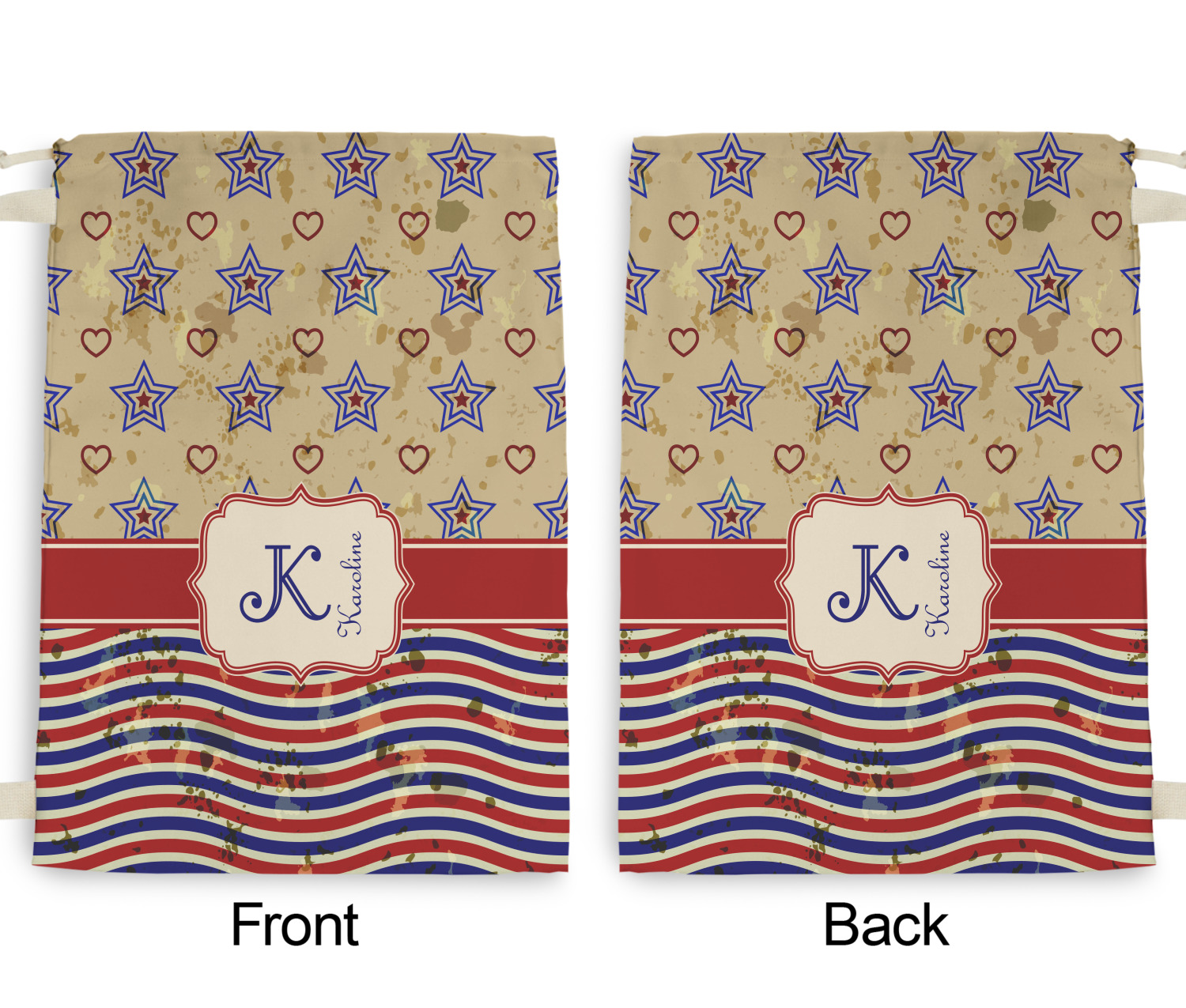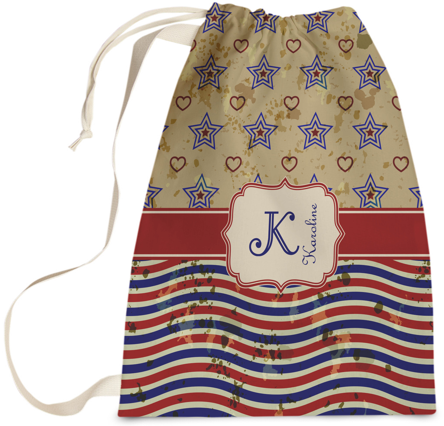 Carry your laundry in style with these customized laundry bags. Available in two sizes, featuring a natural colored woven strap and a cinch cord, these bags hold a lot of clothes or anything else you want to fit in them.