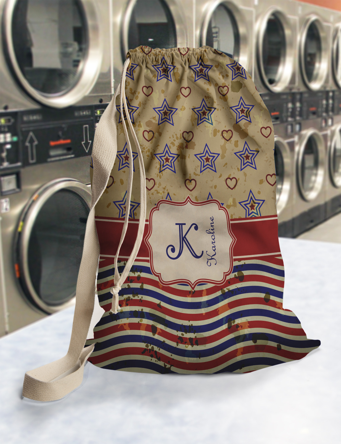 Carry your laundry in style with these customized laundry bags. Available in two sizes, featuring a natural colored woven strap and a cinch cord, these bags hold a lot of clothes or anything else you want to fit in them.