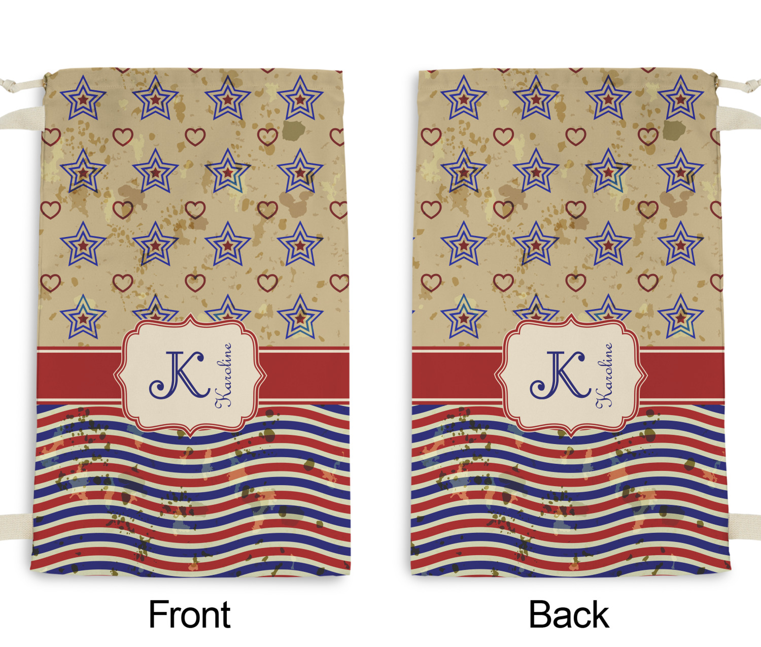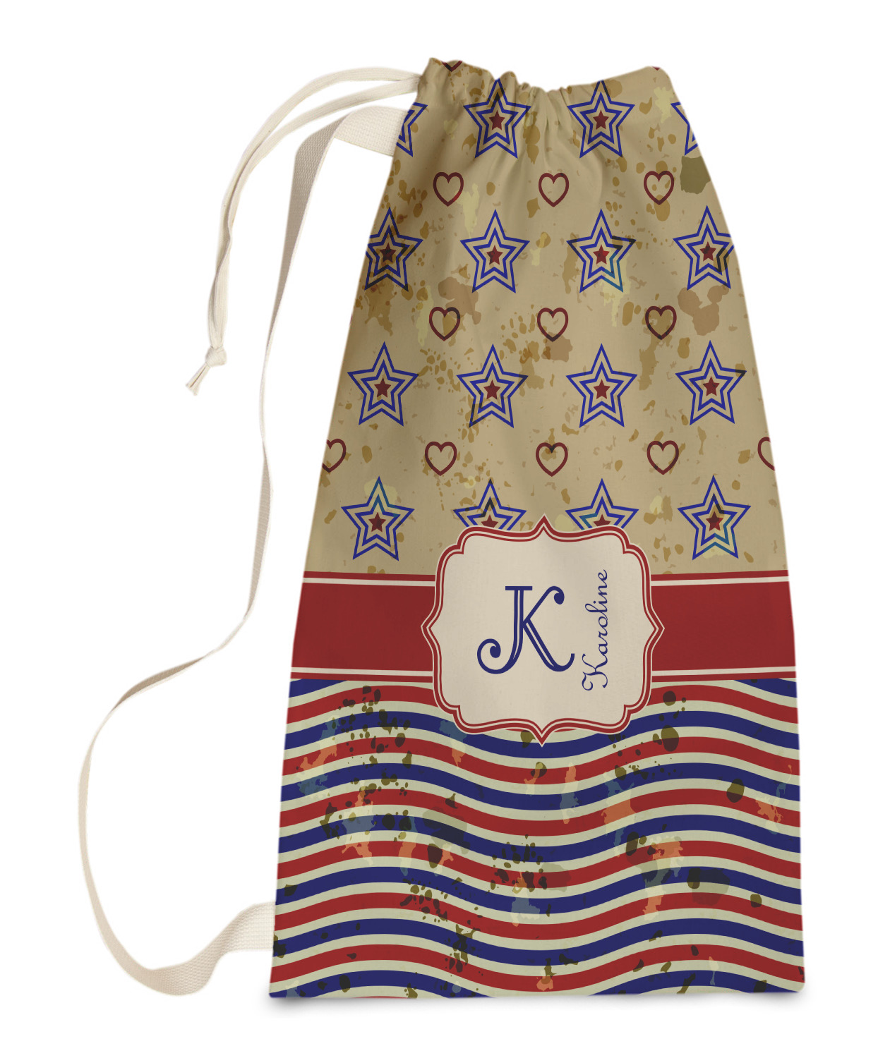 Carry your laundry in style with these customized laundry bags. Available in two sizes, featuring a natural colored woven strap and a cinch cord, these bags hold a lot of clothes or anything else you want to fit in them.