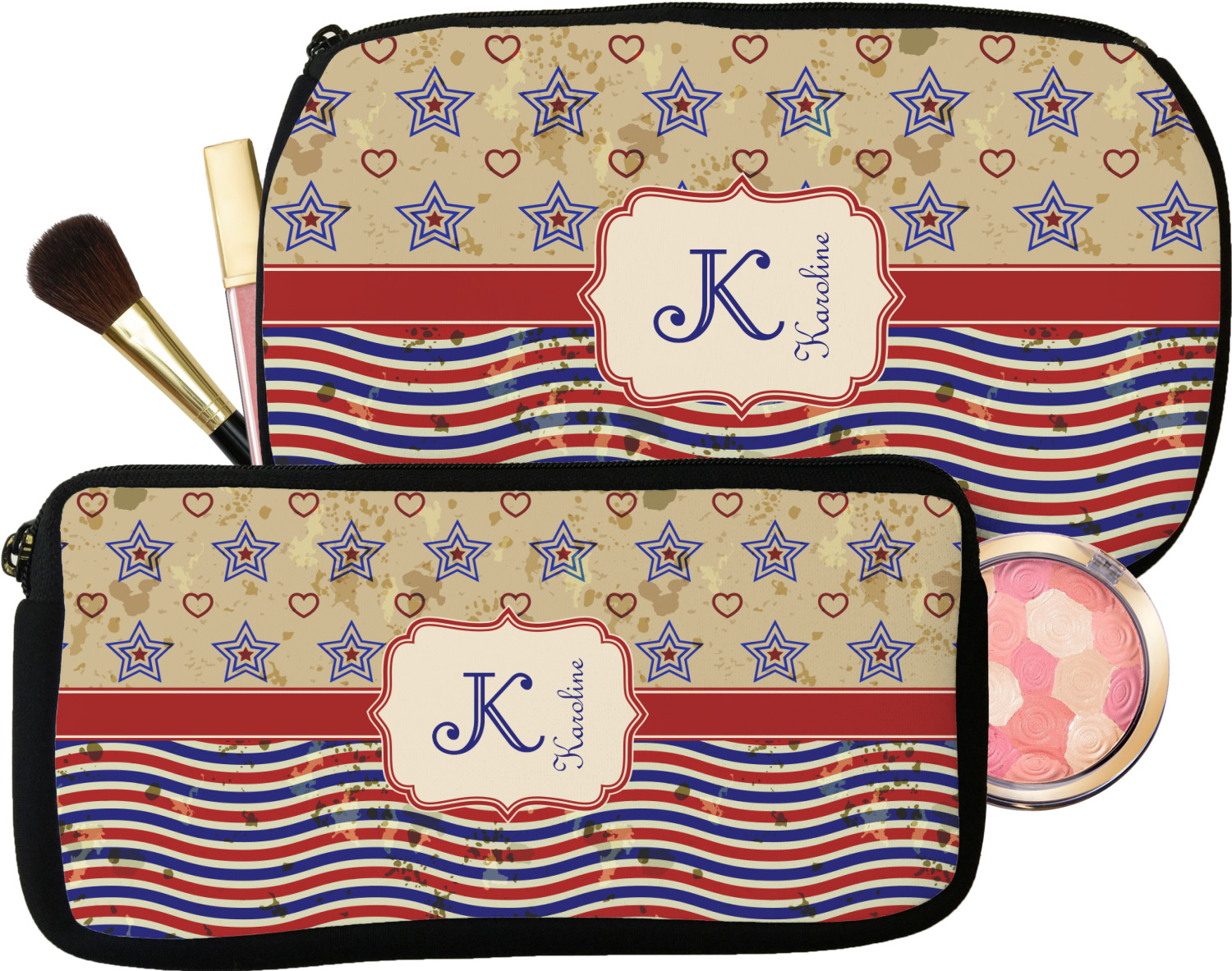 Our personalized makeup bags are available in many different designs, patterns and colors - so you are sure to find one that will love. They are made of neoprene (same material as wet-suits) and thus are water resistant, so spillages in your makeup bag will not end up all over you purse. They are customized on one side and are black on the other side and the zipper is black as well.