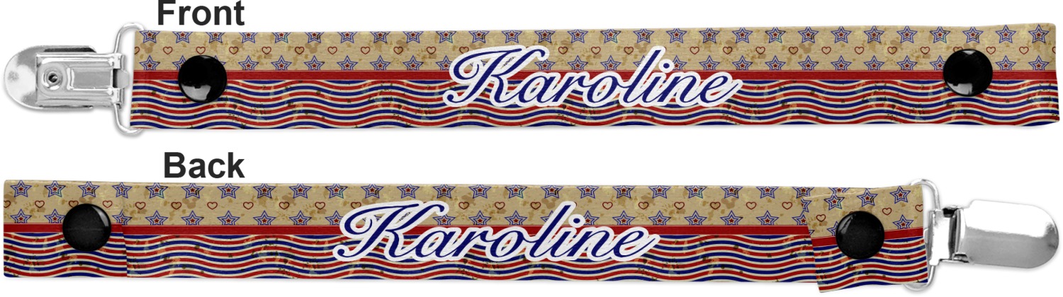 This personalized pacifier clip is the ideal size and measures at approximately 7.5 inches in length, when either end is snapped closed. On one end, you'll find a snap button. This button of your baby's pacifier holder is what can be attached to their pacifier to hold is securely in place. Simply open the snap, slip it through the pacifier opening, and snap it back into place. On the opposite end of this baby pacifier holder, you'll find a metal clip that can secure to a baby's collar or sleeve. This clip ensures that the strap stays in place, and that your baby's pacifier is always on hand.