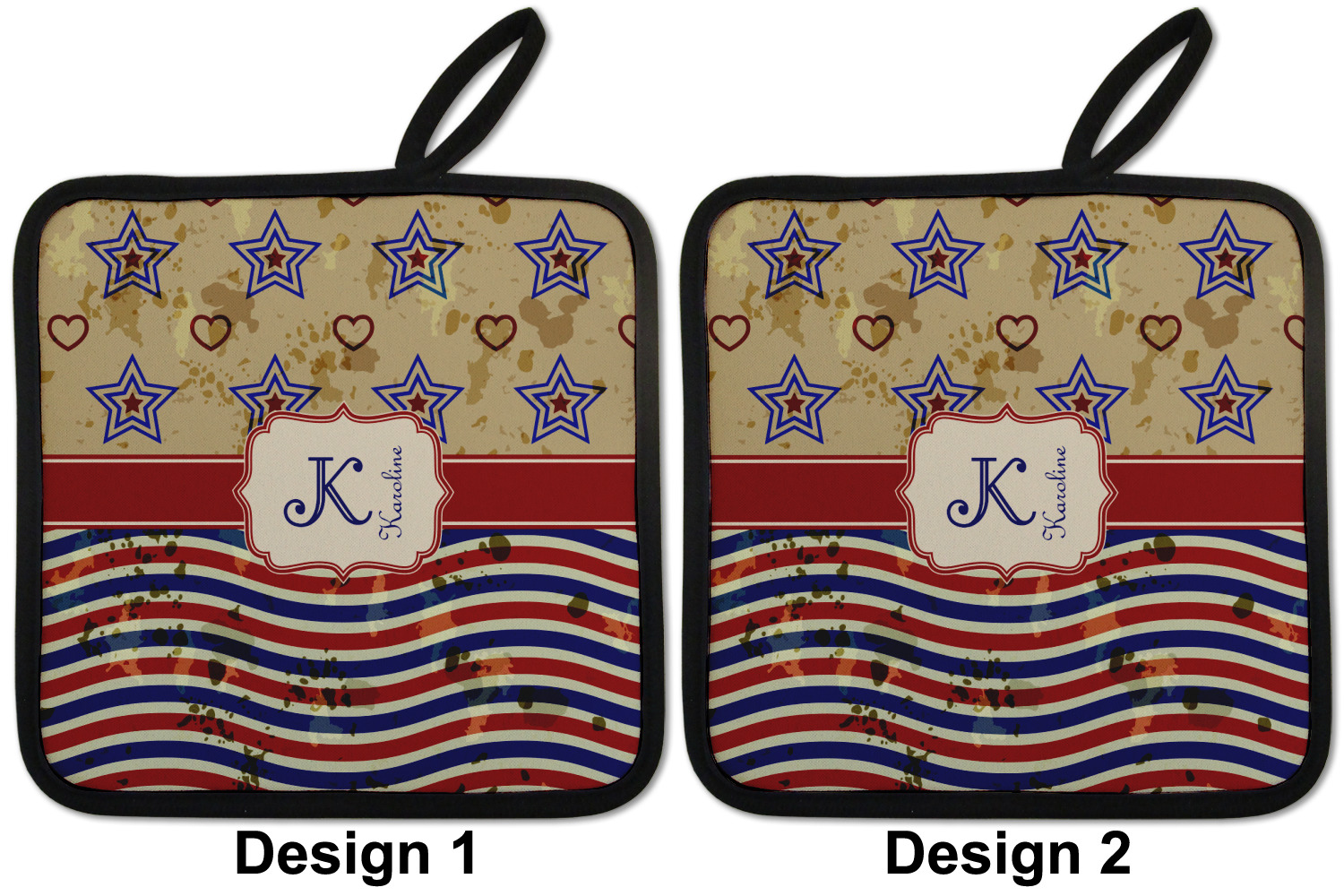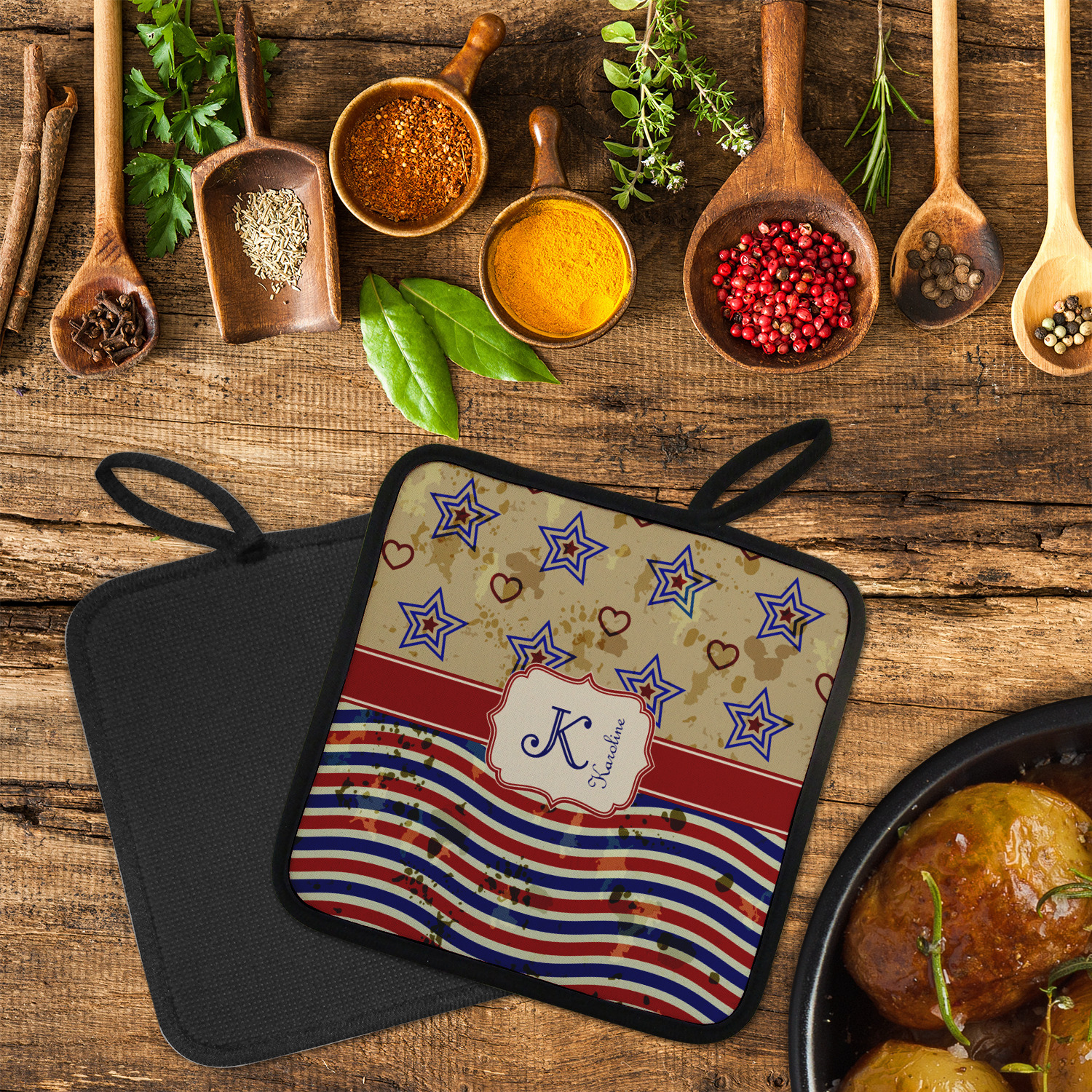 Our personalized pot holders feature a neoprene front that displays your personalization in vibrant colors. The backing of the hot pot holder is rubberized; the textured backing allows you to have a great grip when using this custom pot holder. The two materials are joined with a sleek, black trim, and the holder also includes an attached loop for hanging and storage. The pot holder is approximately 8.75 inches by 8.75 inches and 0.25 inches tall, while the fabric loop is 2.5 inches long. You can purchase a kitchen pot holder by itself or as a set of 2. We also offer a set including one pot holder and one oven mitt.