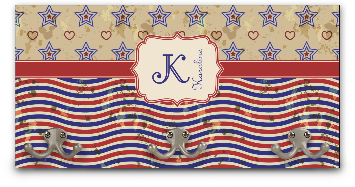 This coat rack is the perfect way to add some personality to your wall or entryway. The board is made of a strong maple that is approximately 16" x 8". The three 2-prong hooks are a sturdy metal that have three screws attaching them to the board. Your design is printed right onto the front of the board while the back and sides are a simple black.