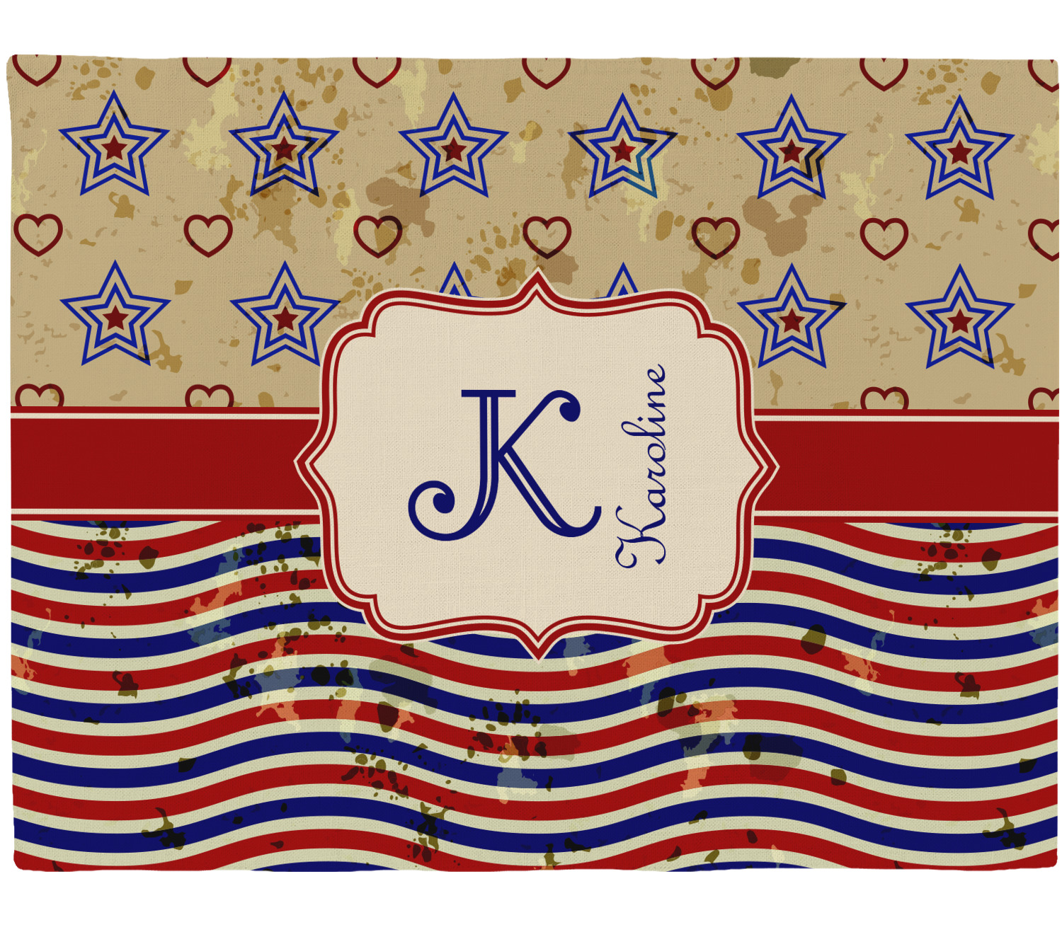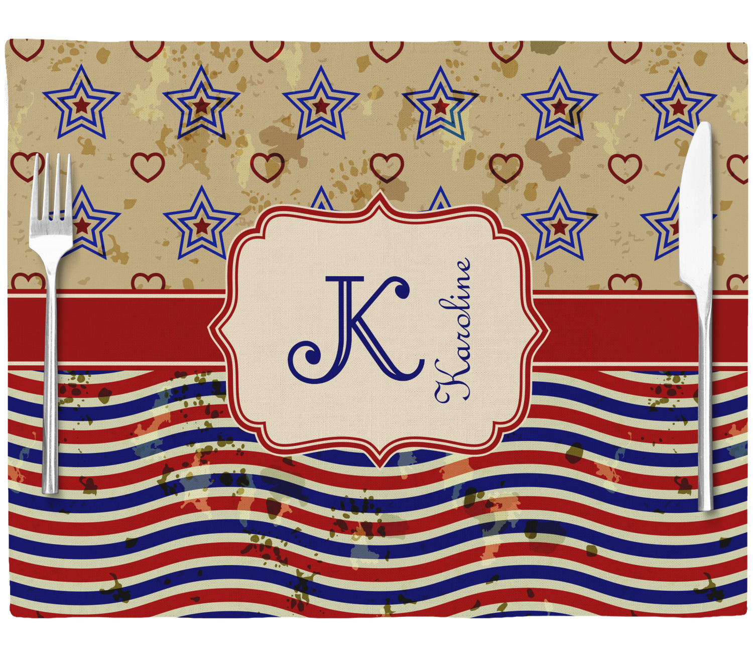 Each of our table mats are a poly twill material with woven burlap detailing. This creates a soft, quality placemat for us to fully print your personalized design across. The woven twill also adds a wrinkle-free surface to set your table! Each customizable placemat is a rectangle shape measuring at approximately 13 x 18 and printed here in the USA.