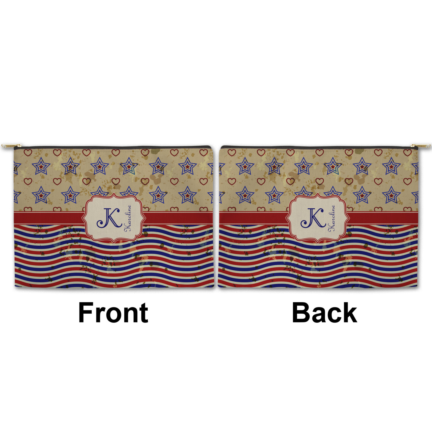 You can design both the front and the back of the pouch - same design, two complementary designs or two totally different designs - the choice is yours! We offer many different personalization styles i.e. name, name & initial, monograms - so the choice to personalize is also yours.