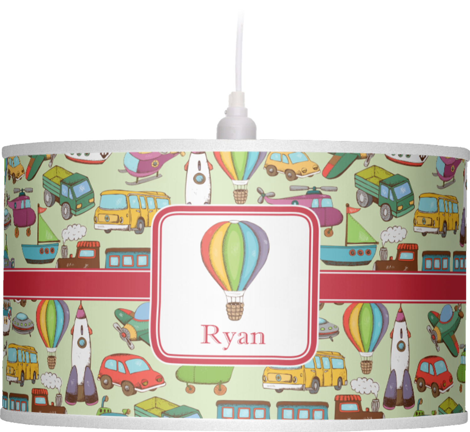 We have featured the various forms of transportation on a soft green background, with a classic red ribbon and square label. The label features a vintage hot air, along with a name for personalization.