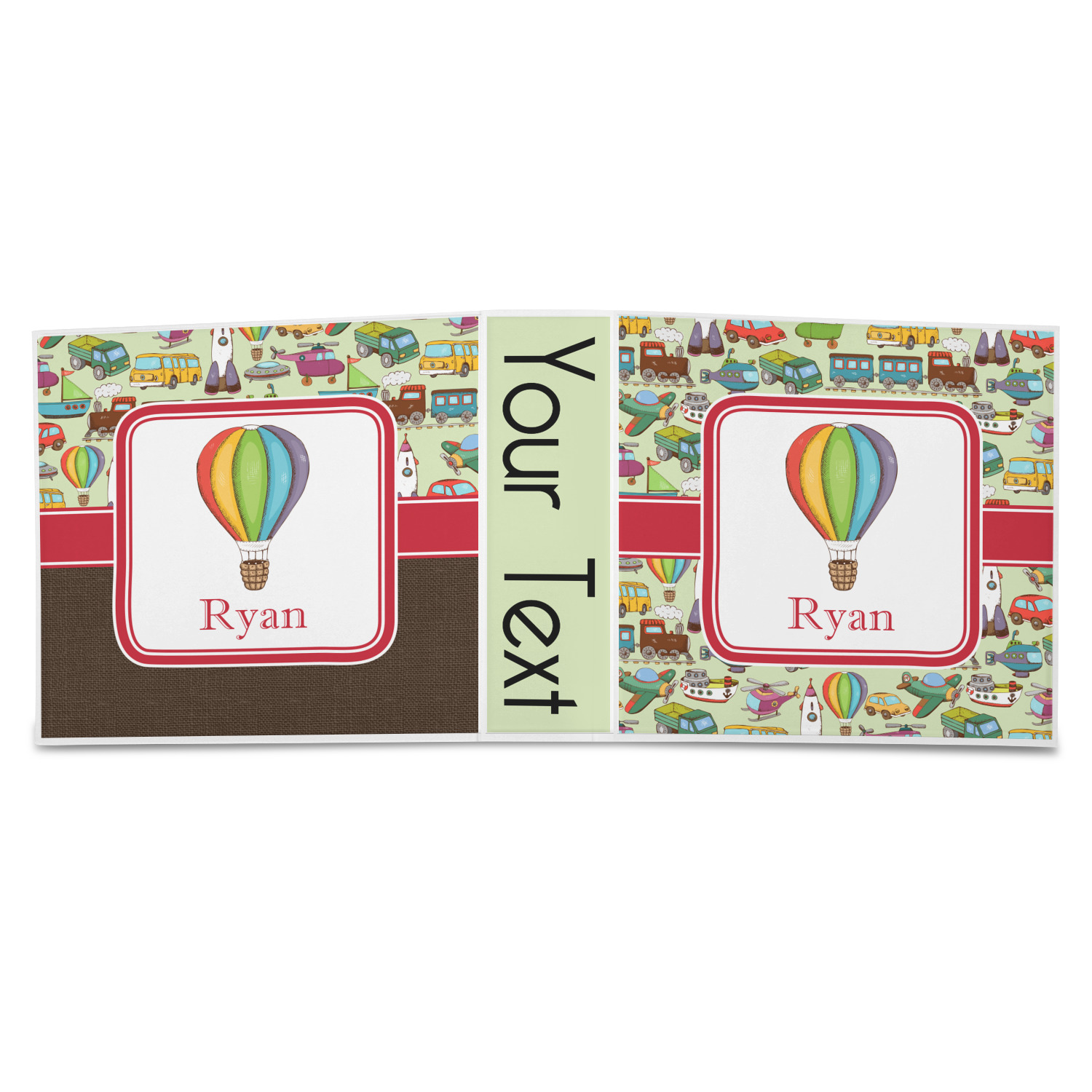 We have featured the various forms of transportation on a soft green background, with a classic red ribbon and square label. The label features a vintage hot air, along with a name for personalization.