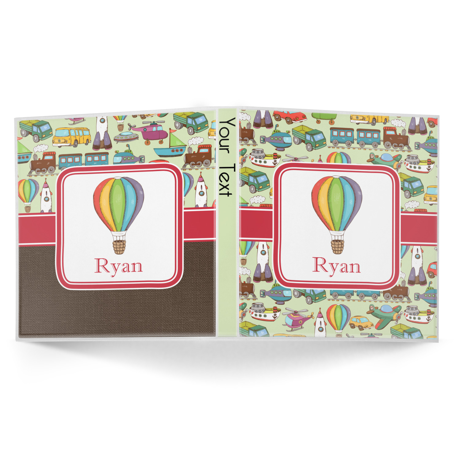 We have featured the various forms of transportation on a soft green background, with a classic red ribbon and square label. The label features a vintage hot air, along with a name for personalization.