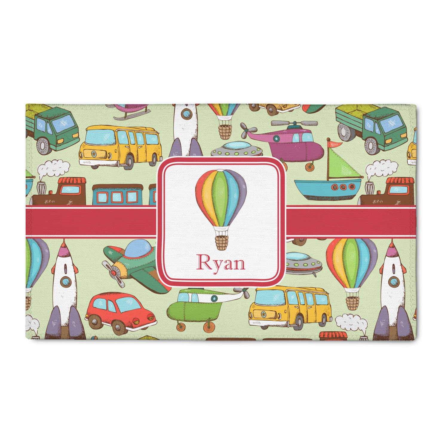 We have featured the various forms of transportation on a soft green background, with a classic red ribbon and square label. The label features a vintage hot air, along with a name for personalization.