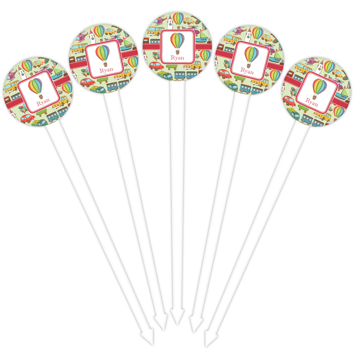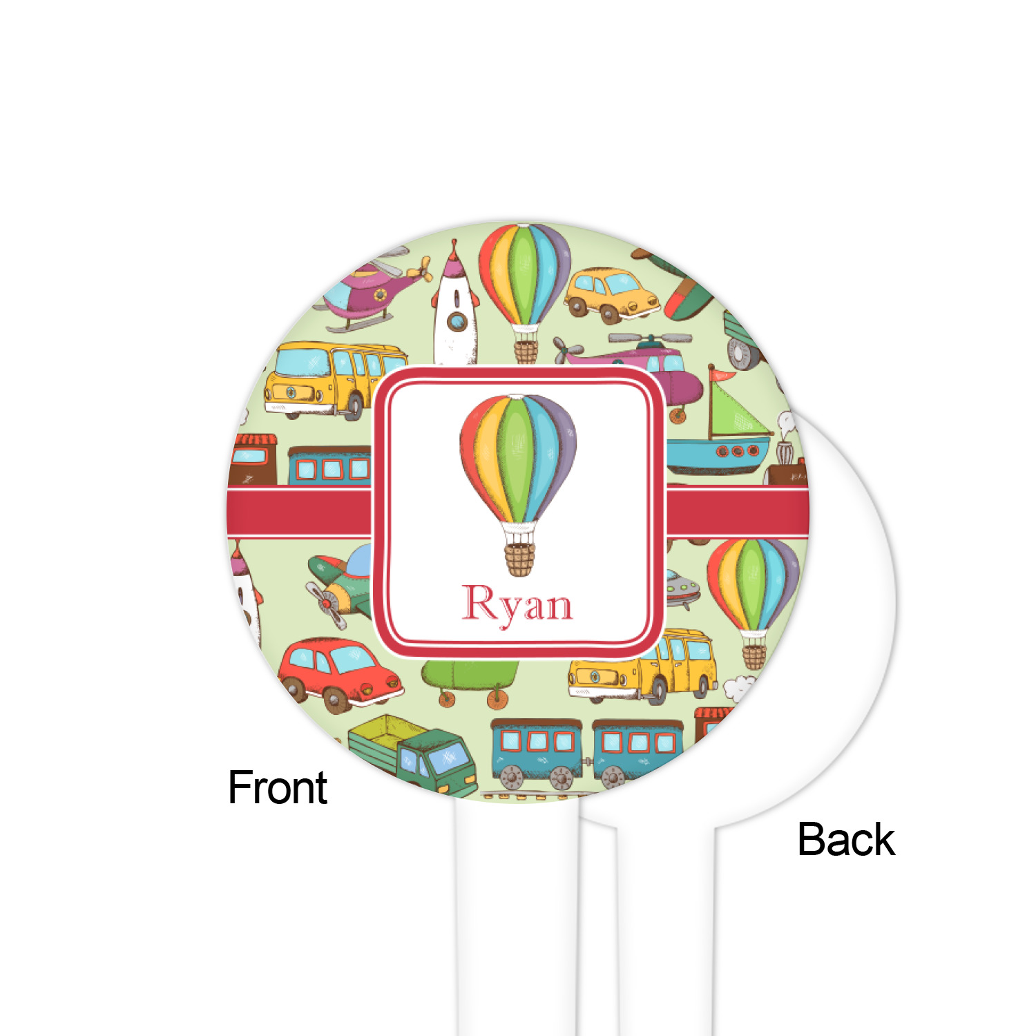 We have featured the various forms of transportation on a soft green background, with a classic red ribbon and square label. The label features a vintage hot air, along with a name for personalization.