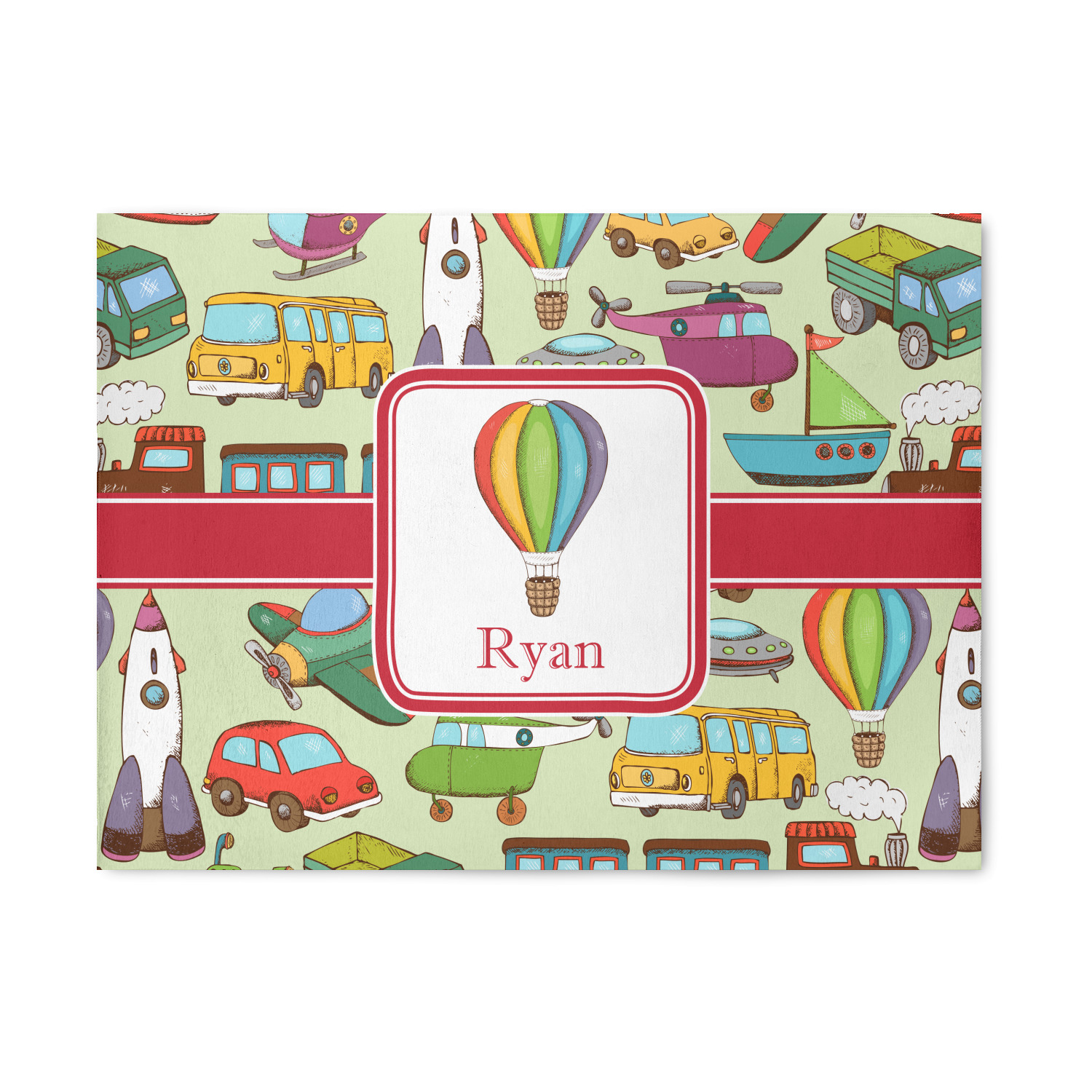 We have featured the various forms of transportation on a soft green background, with a classic red ribbon and square label. The label features a vintage hot air, along with a name for personalization.