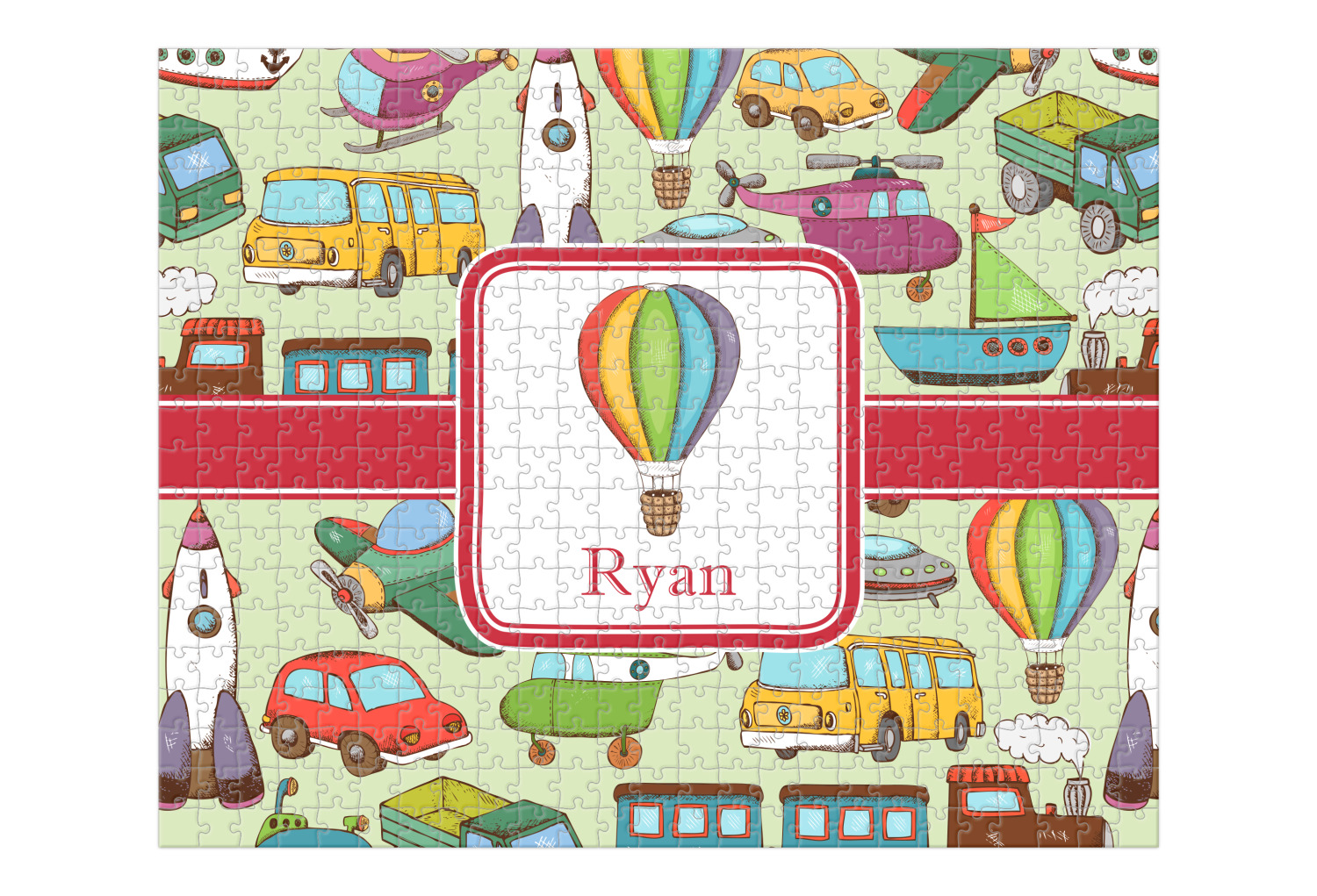 We have featured the various forms of transportation on a soft green background, with a classic red ribbon and square label. The label features a vintage hot air, along with a name for personalization.