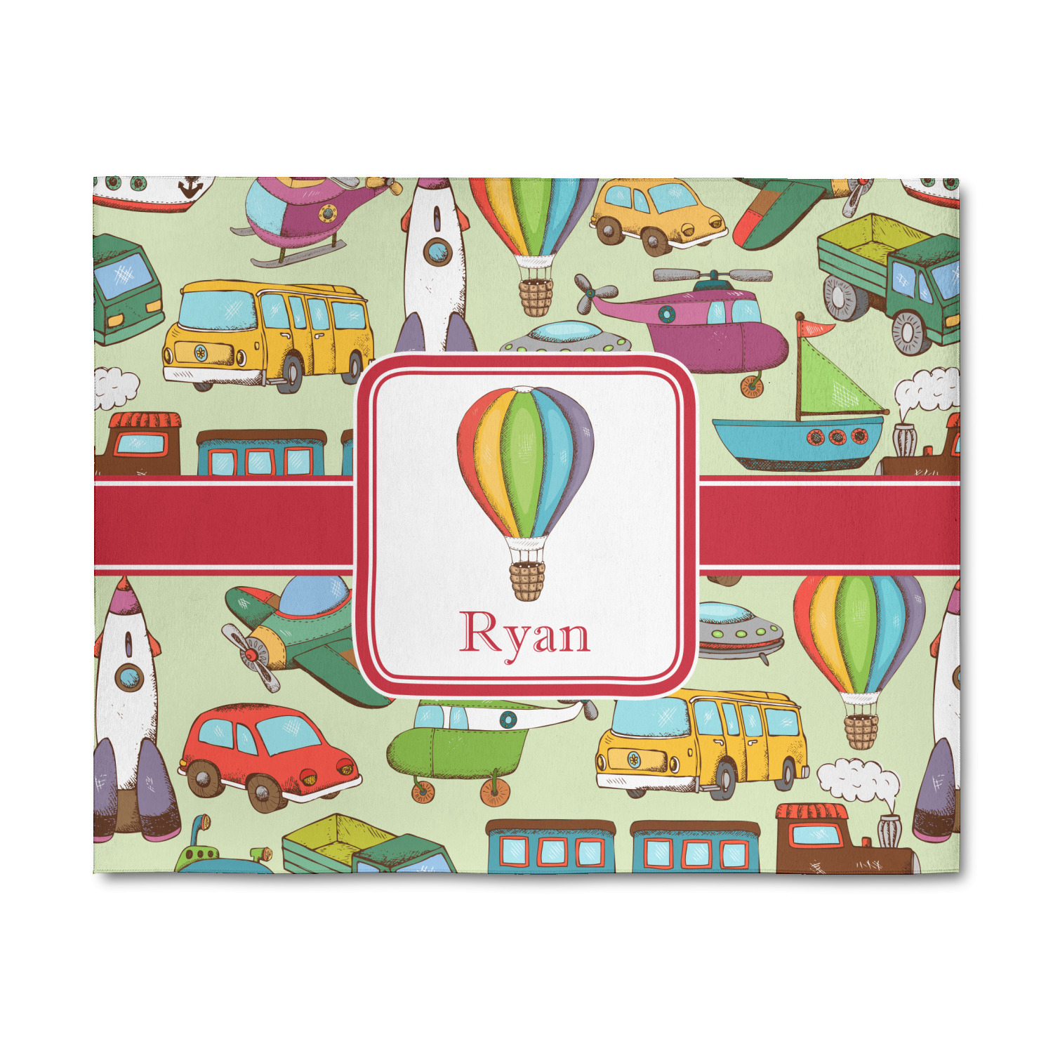We have featured the various forms of transportation on a soft green background, with a classic red ribbon and square label. The label features a vintage hot air, along with a name for personalization.