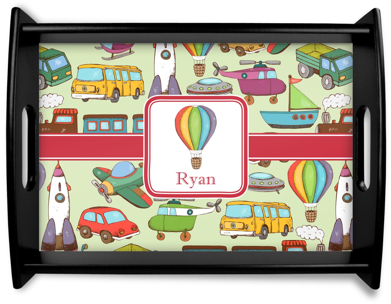 We have featured the various forms of transportation on a soft green background, with a classic red ribbon and square label. The label features a vintage hot air, along with a name for personalization.