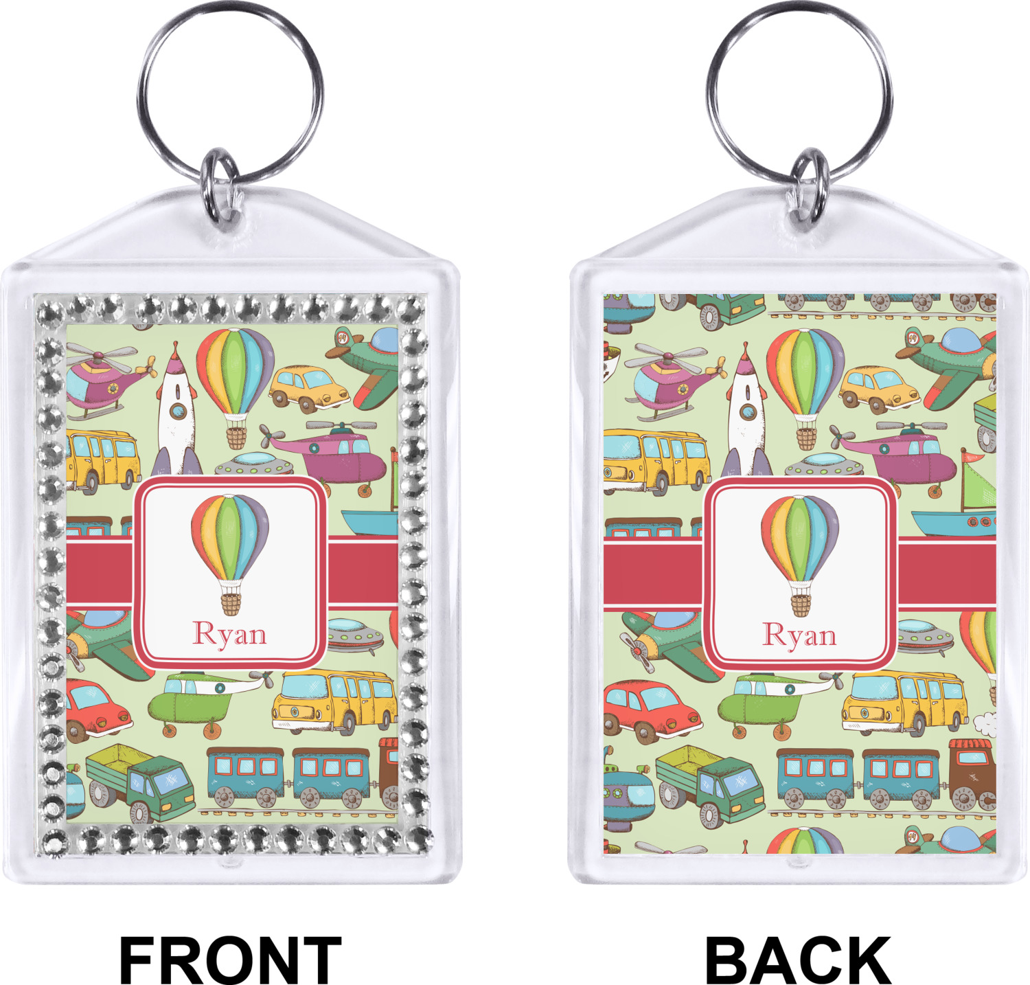 Our personalized keychains have a bold, rectangular shape, outlined by a series of shimmering rhinestones. A metal, split keyring is included with your purchase, and an additional metal hoop allows for attachment of the keychain to the split ring. This unique keychain measures at about 3.75 by 2.5 inches. We print your customized design(s) across both the back and front of this keychain.