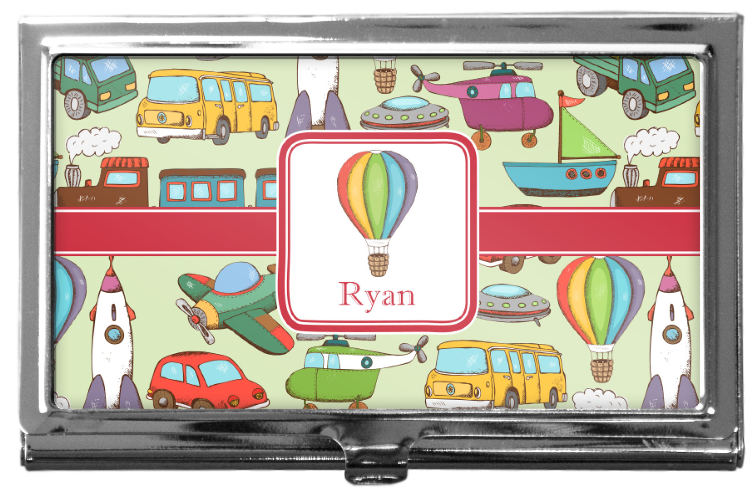 We have featured the various forms of transportation on a soft green background, with a classic red ribbon and square label. The label features a vintage hot air, along with a name for personalization.