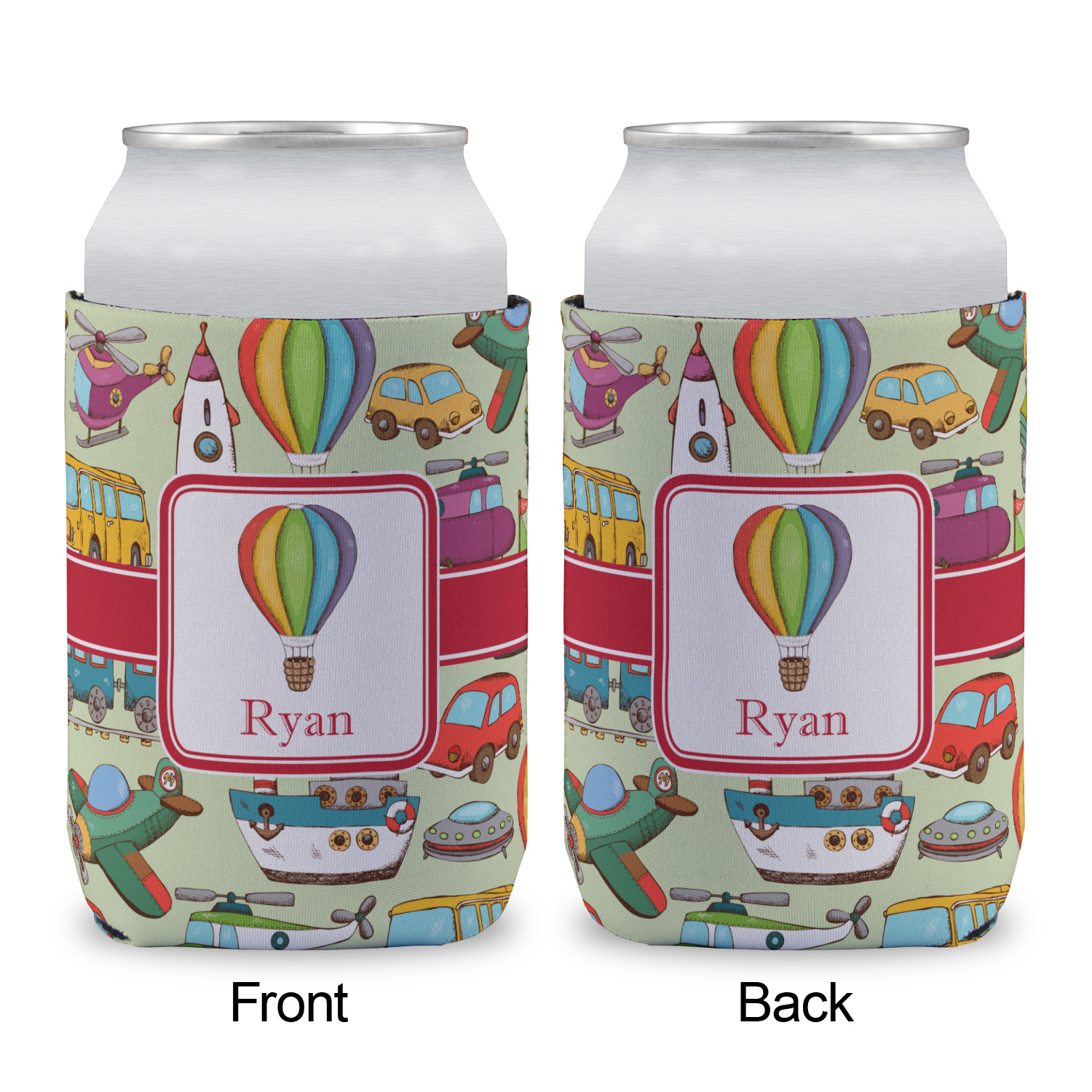 We have featured the various forms of transportation on a soft green background, with a classic red ribbon and square label. The label features a vintage hot air, along with a name for personalization.