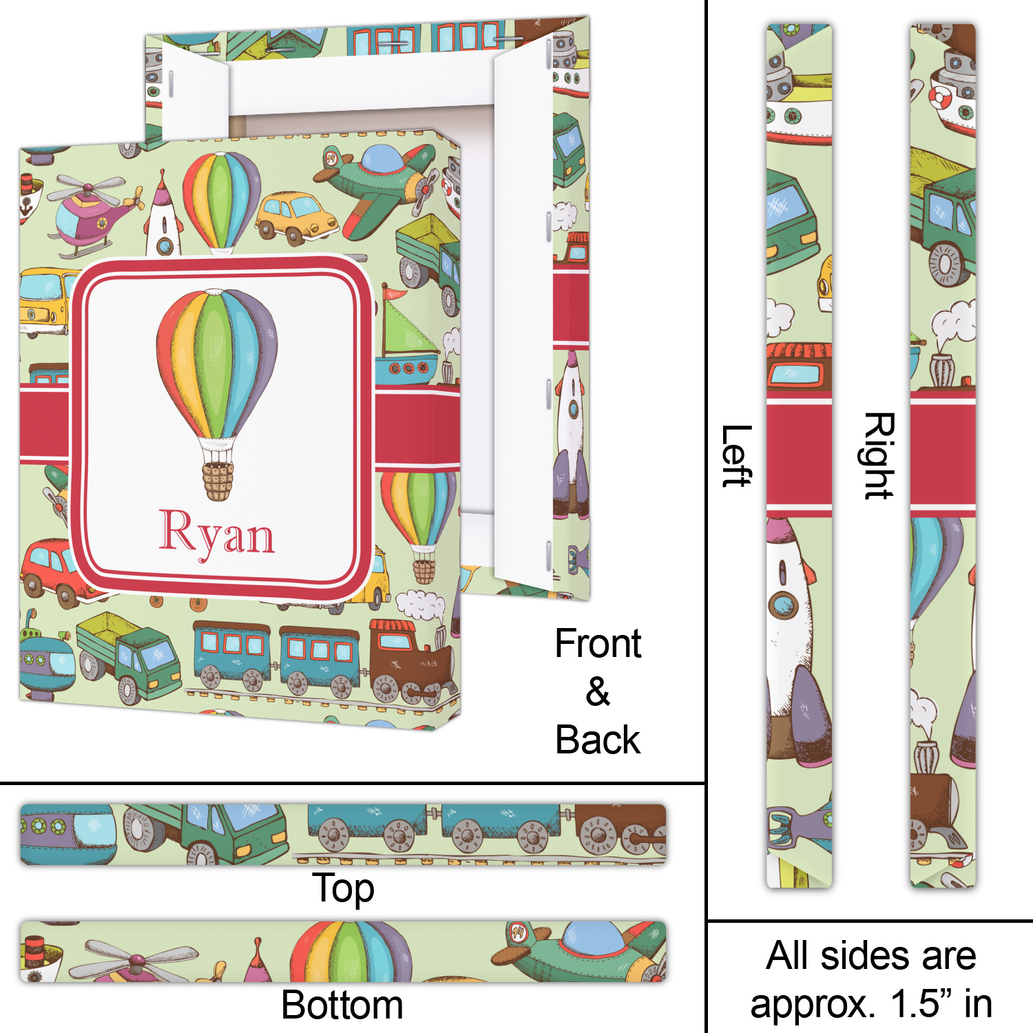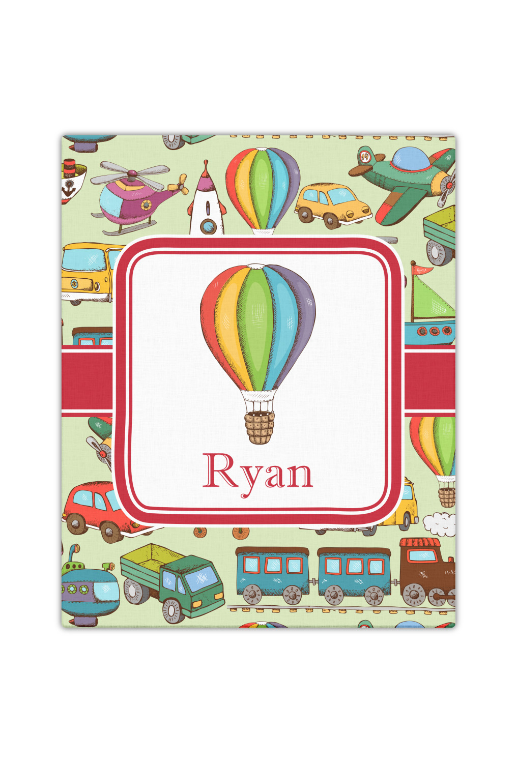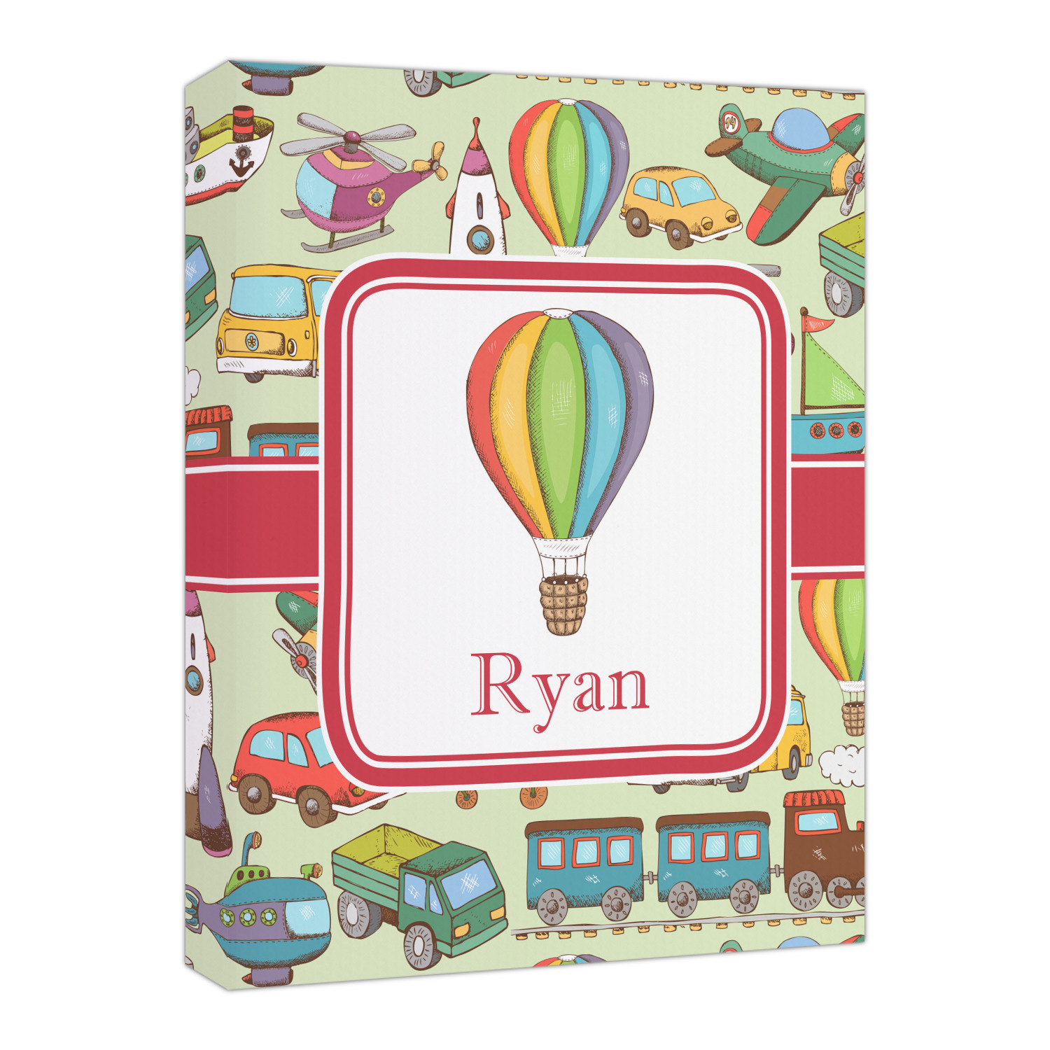We have featured the various forms of transportation on a soft green background, with a classic red ribbon and square label. The label features a vintage hot air, along with a name for personalization.