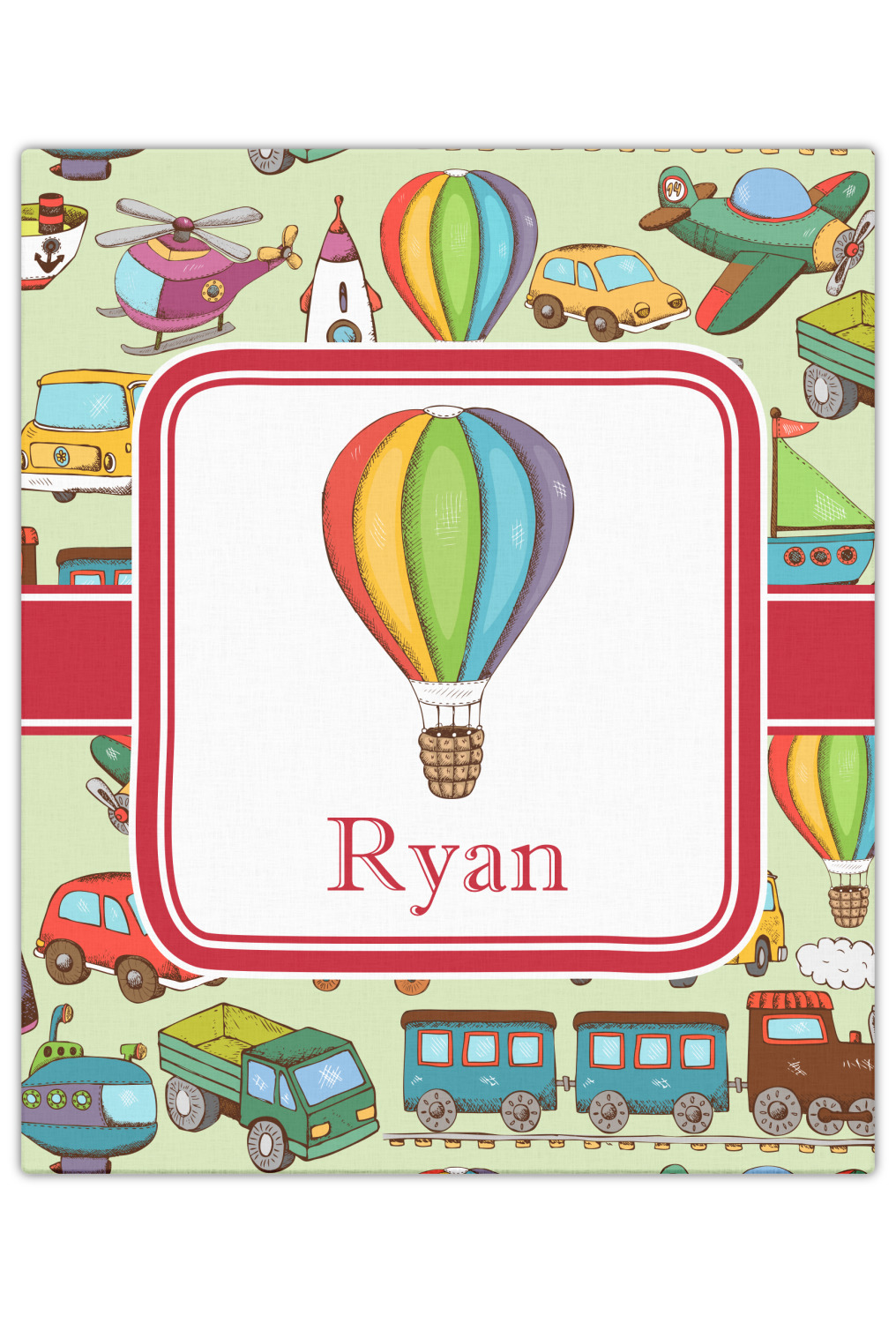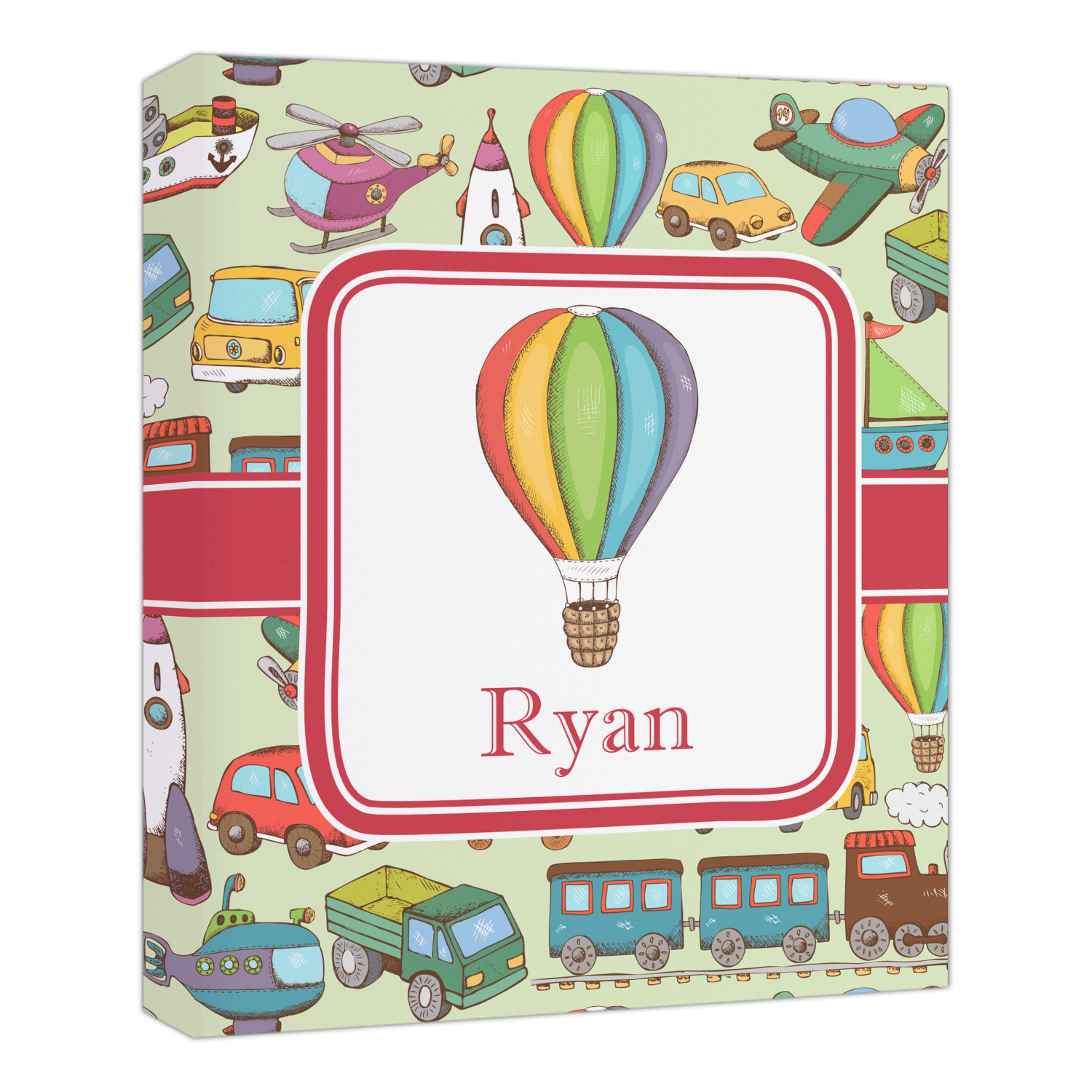 We have featured the various forms of transportation on a soft green background, with a classic red ribbon and square label. The label features a vintage hot air, along with a name for personalization.