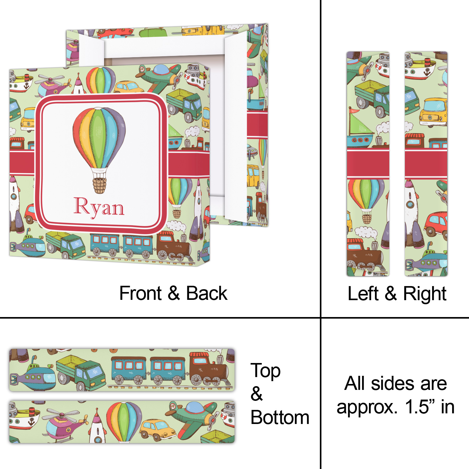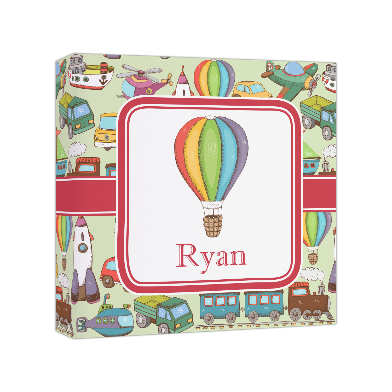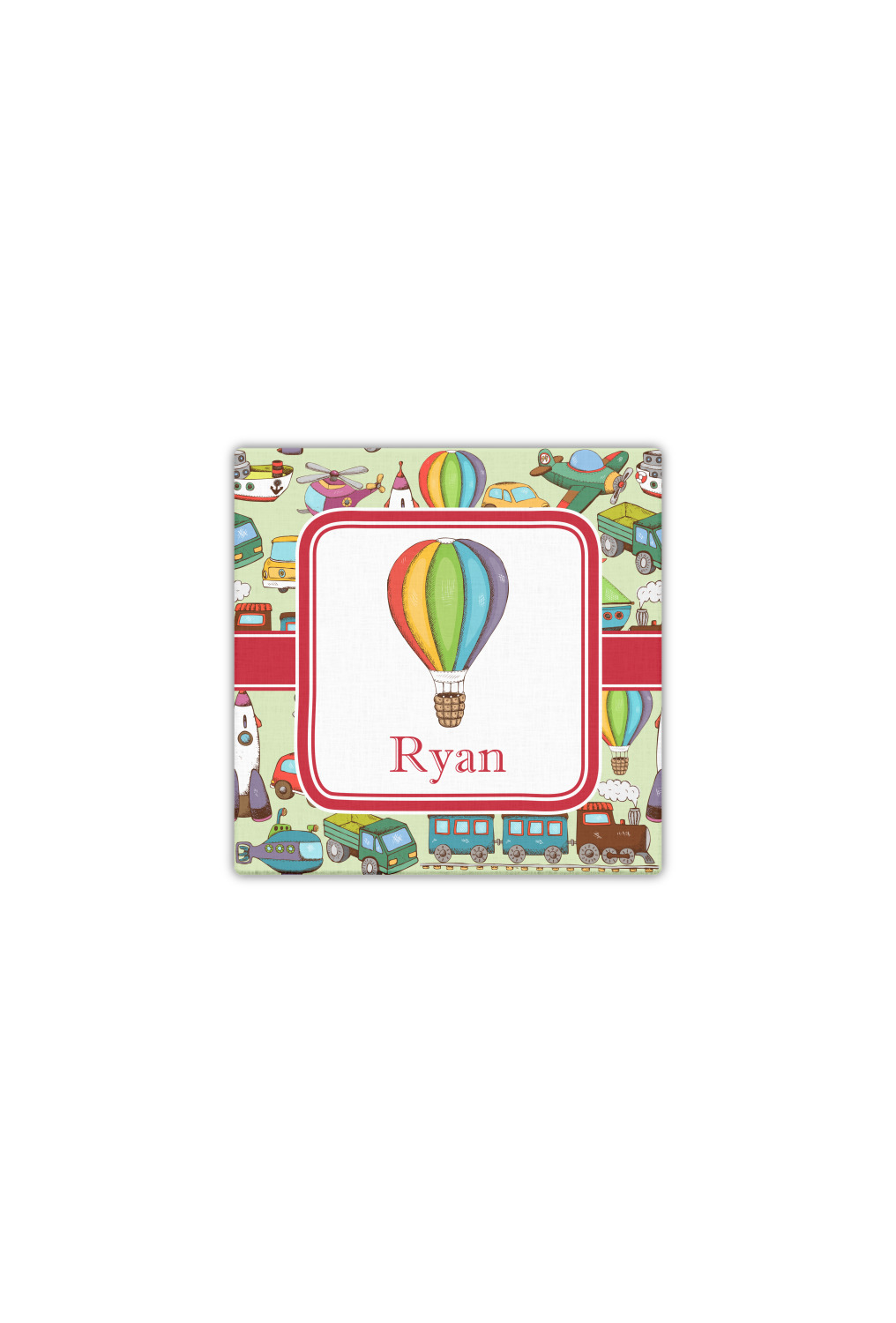 We have featured the various forms of transportation on a soft green background, with a classic red ribbon and square label. The label features a vintage hot air, along with a name for personalization.