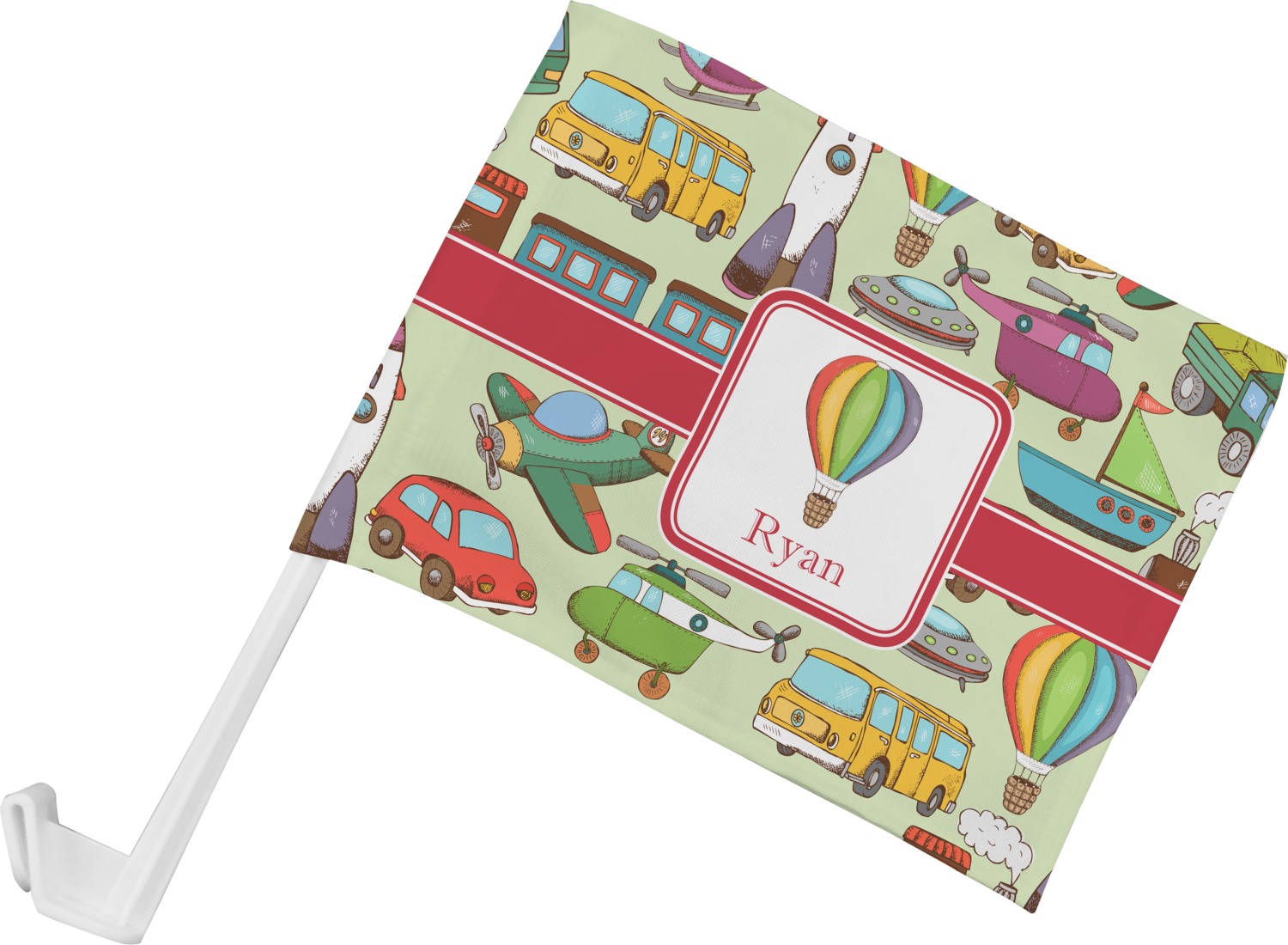 We have featured the various forms of transportation on a soft green background, with a classic red ribbon and square label. The label features a vintage hot air, along with a name for personalization.