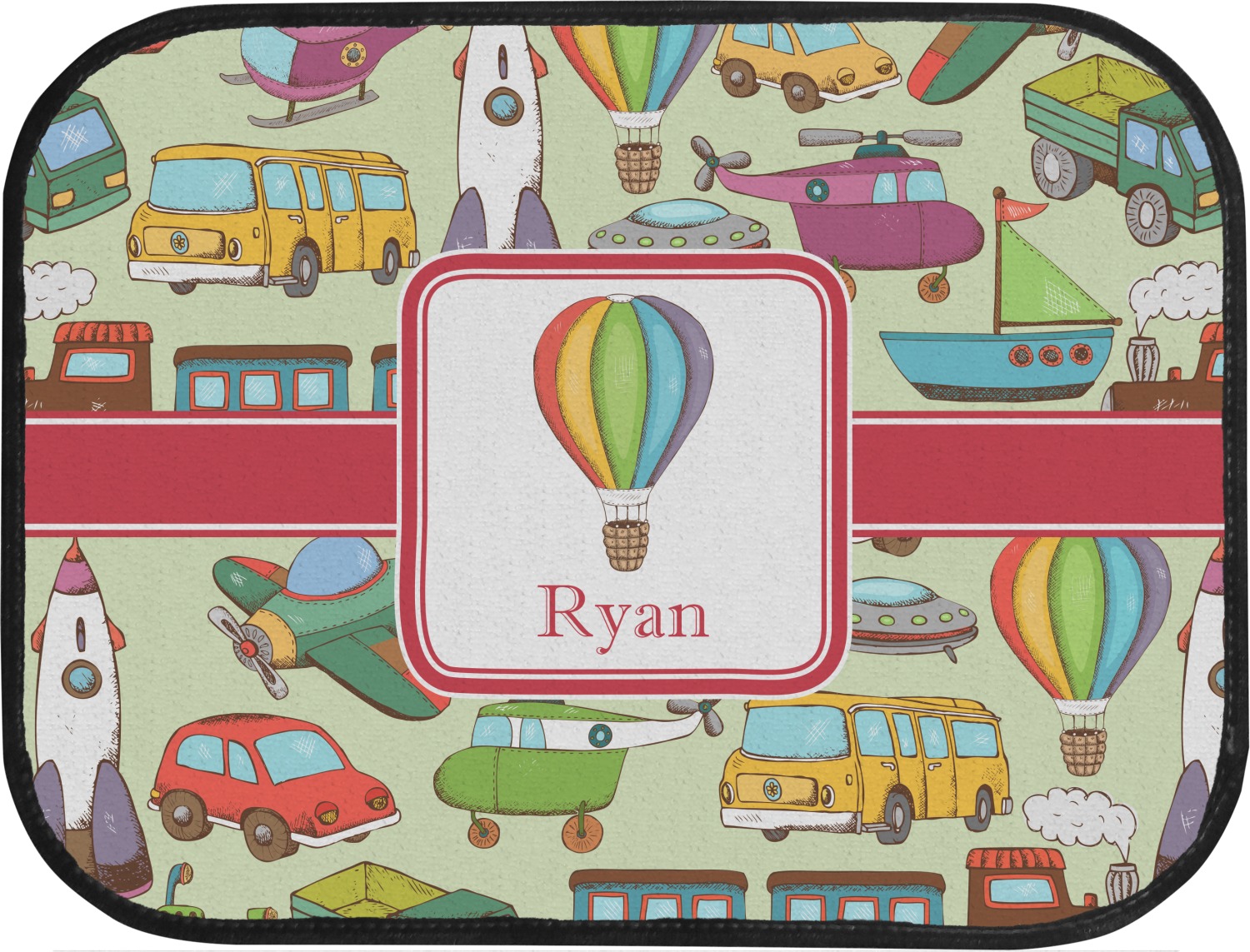 We have featured the various forms of transportation on a soft green background, with a classic red ribbon and square label. The label features a vintage hot air, along with a name for personalization.
