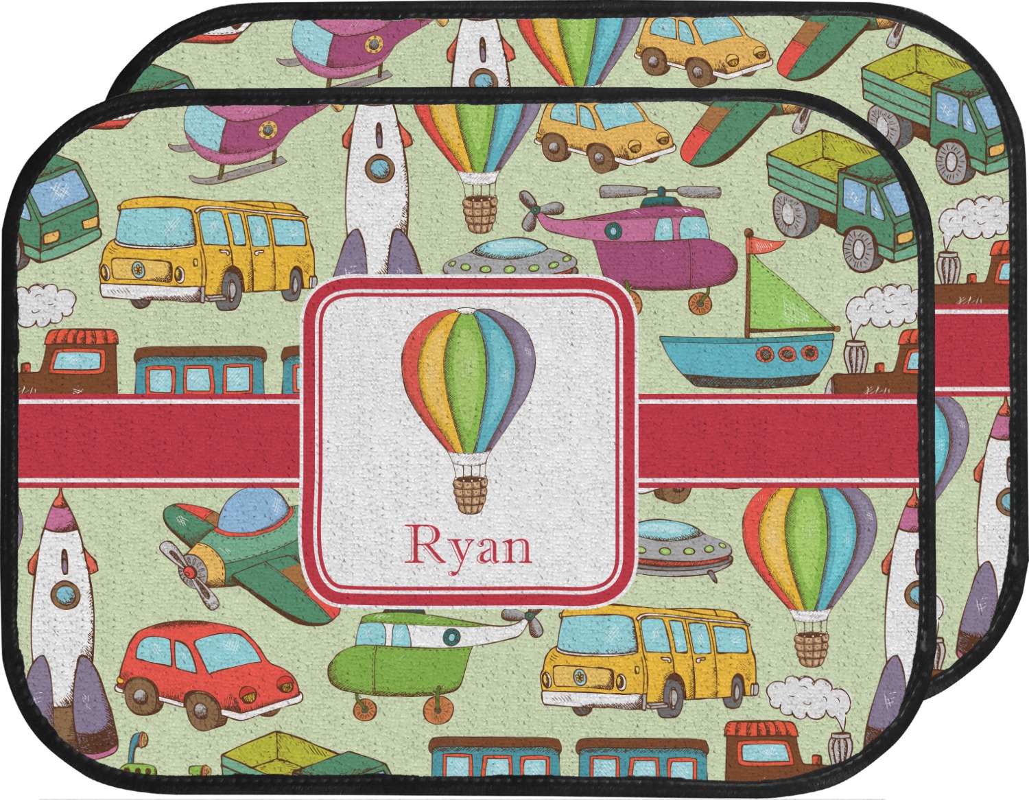 We have featured the various forms of transportation on a soft green background, with a classic red ribbon and square label. The label features a vintage hot air, along with a name for personalization.